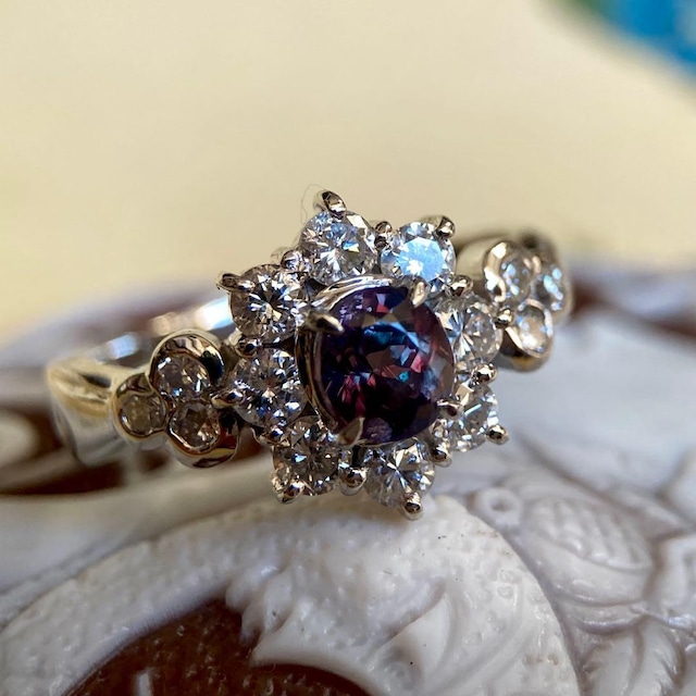 澄んだ光のもとでは深みのあるブルー、 あたたかな灯りの下では、まるで濃厚な赤ワインのような赤紫へ — GIA鑑別書付き 妖艶ともいえるほど印象的なカラーチェンジを見せる、ブラジル産アレキサンドライトのリングです。 主石は、色の切り替わりが非常に美しく、光源によってまったく異なる表情を見せる一石。 写真からもその変化は十分に感じていただけるかと思いますが、実際に身につけた際の奥行きある色彩と艶やかさは、この石が持つ“品格”をはっきりと物語ります。 こちらのアレキサンドライトには、GIA(米国宝石学会)の鑑別書が付属しております。 産地がブラジルであること、宝石の特性が第三者機関によって確認されており、希少性の高いアレキサンドライトを安心してお迎えいただける一本です。 光を受けるたび、石の奥から浮かび上がる赤紫のニュアンスは、落ち着きのある艶と、どこか危うさを感じさせる美しさを併せ持ち、見る人の視線を自然と引き寄せます。 可憐さよりも、成熟した気品と存在感を纏うアレキサンドライトです。 取り巻きにはダイヤモンドを贅沢に配し、主石を守るように、そして際立たせるように設計されたクラシカルな構成。 華やかでありながら決して騒がしくならず、指元に確かな主役感と、揺るぎない品格を添えています。 数あるアレキサンドライトの中でも、色の深さ、変化の美しさ、そして全体の完成度までを見極めて選び抜いた一本。 日常の役割からそっと離れ、本来の自分へと戻るためのスイッチのような存在。 このアレキサンドライトは、内側に秘めた魅力を静かに呼び覚まします。 インスタグラムでも動画をアップしておりますので、ぜひこちらも合わせてご覧ください。 https://www.instagram.com/reel/DULeJZRj8n3/?utm_source=ig_web_copy_link&igsh=MzRlODBiNWFlZA== 【刻印】 ・ pt900(陽刻) ・ アレキサンドライト 0.39ct ・ ダイヤモンド 0.58ct 【重さ】 ・ 約6g 【リングサイズ】 ・ 約8号