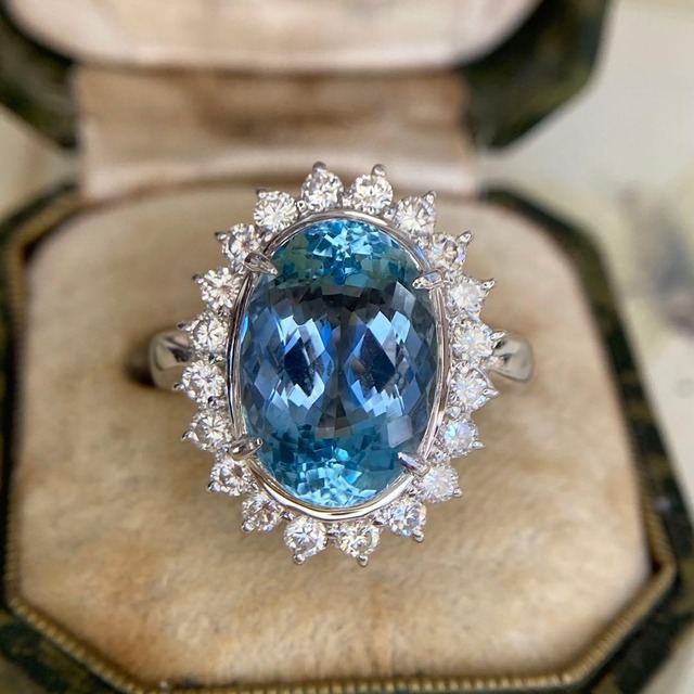 静謐な青を纏う サンタマリアアクアマリン 4.28ct リング 中央宝石鑑別書付き かな海の奥深くを思わせる、澄み切った濃密なブルー。 こちらのリングに留められたアクアマリンは、一般的な淡色のイメージを超えた、ひと目で印象に残る特別な色彩を湛えています。中央宝石研究所の鑑別により、その希少な色調が「サンタマリア」と認められた一石。限られた条件下でのみ生まれる、選ばれしアクアマリンならではの美しさです。 4.28ctという堂々たるサイズを持ちながら、印象はあくまでも端正で静謐。 それは、この石が備える極めて高い透明度と、深みのある落ち着いたブルートーンによるものです。光を受けるたび、石の奥から澄んだテリが立ち上がり、指先に涼やかな気品を添えてくれます。華やかでありながら決して過剰にならず、大人の女性の佇まいに自然と溶け込む存在感です。 周囲を取り巻くダイヤモンドもまた、一石一石が美しい輝きを放つ上質なものを厳選。 プラチナの清らかな光沢、繊細なダイヤモンドの煌めき、そしてサンタマリアカラーの深い青が響き合い、まるで光をたたえた水面を切り取ったかのような表情を生み出しています。 身につけるたびに、心がすっと澄みわたるような感覚。 日常の装いを静かに格上げし、長く寄り添うにふさわしい、確かな価値を備えたサンタマリアアクアマリンリングです。 インスタグラムでも動画をアップしておりますので、ぜひこちらも合わせてご覧ください。 https://www.instagram.com/reel/DTmj35kESS_/?utm_source=ig_web_copy_link&igsh=MzRlODBiNWFlZA== 【刻印】 ・ pt900 ・ サンタマリアアクアマリン 4.28ct ・ ダイヤモンド 0.62ct 【重さ】 ・ 約8.68g 【リングサイズ】 ・ 約8.5号