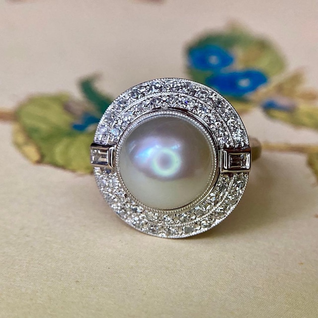 昭和初期の手仕事が息づく白蝶パール ダイヤモンドリング 昭和初期、日本の宝飾文化が静かに成熟していった時代に生み出された、白蝶パールのアンティークリングです。 ひと目で感じられるのは、現代の量産品とは明らかに異なる、凛とした佇まい。時を重ねたからこそ生まれる落ち着きと、指先にすっと馴染む上品さを備えています。 中央に据えられた白蝶パールは、長い年月を経た今もなお、内側から柔らかく光を放つような美しい艶を保っています。 表面の状態も良く、昭和初期の作品とは思えないほど瑞々しい印象です。真珠特有の穏やかな輝きが、身につける人の所作まで美しく見せてくれるような、不思議な存在感を宿しています。 このリングの最大の魅力は、当時の職人技が凝縮された仕立ての美しさにあります。 一般的なパールリングに見られる、穴を開けて芯を通したり、接着剤で留める手法とは異なり、こちらはパールを一切傷つけることなく、フクリン留めによって丁寧に固定されています。さらにその縁には、極めて細やかなミル打ちが施され、パールの輪郭を柔らかく、そして気品高く引き立てています。 この構造により、パールの裏側まで非常に美しく保たれており、見えない部分にこそ真価が宿ることを雄弁に物語っています。 当時の職人が、一点一点パールの個性を見極めながら仕立てていたことが、指先から静かに伝わってくるようです。 また、パールの周囲を彩るダイヤモンドも一石一石の輝きは良好で、主張しすぎることなく、あくまでパールを引き立てる名脇役として配置されています。 そのダイヤモンドのラインに沿って施されたミル打ちも非常に繊細で、リング全体に統一感と奥行きを与えています。 さらに、リングの裏側に目を向けると、そこには職人の手仕事による美しい装飾模様が広がります。 普段は目に触れない部分にまで手を尽くす――昭和初期の日本のものづくりらしい、誠実さと美意識が感じられる意匠です。 時代を超えて受け継がれてきた本物の美しさを、ぜひご自身の手元で感じてみてください。 静かに、しかし確かに、日常を豊かにしてくれるリングです。 インスタグラムでも動画をアップしておりますので、ぜひこちらも合わせてご覧ください。 https://www.instagram.com/reel/DTvDC32j9fz/?utm_source=ig_web_copy_link&igsh=MzRlODBiNWFlZA== 【刻印】 ・ pm900 【パール直径】 ・ 10.7mm 【重さ】 ・ 約10.00g 【リングサイズ】 ・ 約11号弱