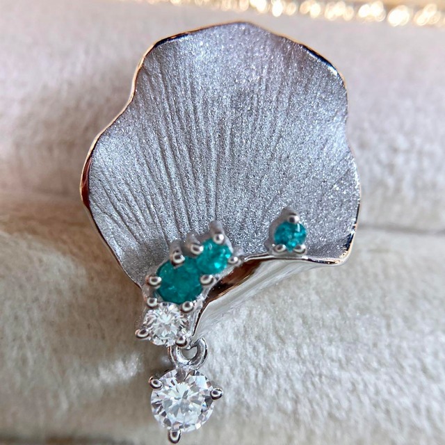 朝露の詩 — 田村俊一先生作 パライバトルマリン&ダイヤモンド ペンダントトップ 朝の静寂にそっと息づく、ひとしずくの物語。 日本の名工・田村俊一先生による本作は、葉に宿る朝露の瞬間を切り取った、まさに自然美の詩です。 繊細に仕上げられたリーフモチーフは、葉脈の一本一本に至るまで緻密に表現されており、まるで本物の葉がそっと胸元に舞い降りたかのよう。淡くマットな質感と滑らかな曲線が、優雅な気配をまといます。 葉にきらりと宿るのは、深く濃密なネオンブルーのパライバトルマリン。銅の含有量2.8%という非常に高い数値と、その鮮やかな発色と透明感からブラジル産であることが推察され、まるで朝露の冷たく澄んだ煌めきを湛えています。 そして、いまにも零れ落ちようとする露を捉えたように輝くのは、極上のダイヤモンド。無垢な光の粒が、胸元にそっと揺れて、見る人の心を奪います。 モチーフの美しさ、卓越した技巧、そして選び抜かれた宝石。どこを取っても一切の妥協がない、まさに“上質”を形にした逸品です。 自然の儚い瞬間を永遠に封じ込めたようなこのペンダントトップは、日常の装いに静かな詩情と気品を添えてくれることでしょう。 ペンダントトップのみの出品となっております。 インスタグラムでも動画をアップしておりますので、ぜひこちらも合わせてご覧ください。 https://www.instagram.com/reel/DK7RhamSAR3/?utm_source=ig_web_copy_link&igsh=MzRlODBiNWFlZA== k18WG パライバトルマリン ダイヤモンド0.27ct ペンダントトップサイズ 縦約25.9mm 横約17.0mm 重さ約3.6g
