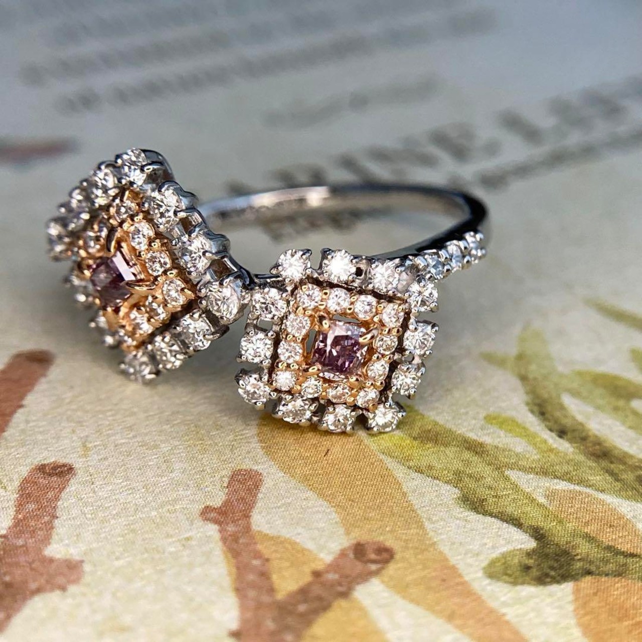 このリングの最大の魅力は、二つのスクエアの中心に配されたFancy Deep Purplish Pinkのダイヤモンド。