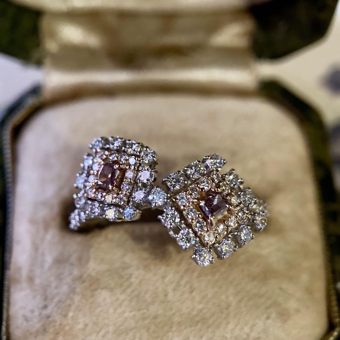 このリングの最大の魅力は、二つのスクエアの中心に配された稀少なるピンクダイヤモンド。その名は「Fancy Deep Purplish Pink」。