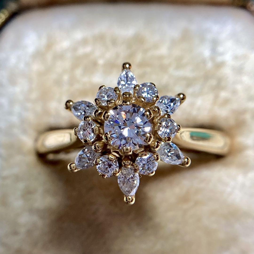 センターにはラウンドブリリアントカットのダイヤモンドを据え、その周囲をマーキスカットとラウンドカットのダイヤモンドで花びらのように取り囲んだ華やかなデザイン。透明度・照りともに申し分のないダイヤモンドが、可憐な輝きを放ちます。