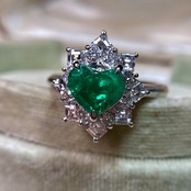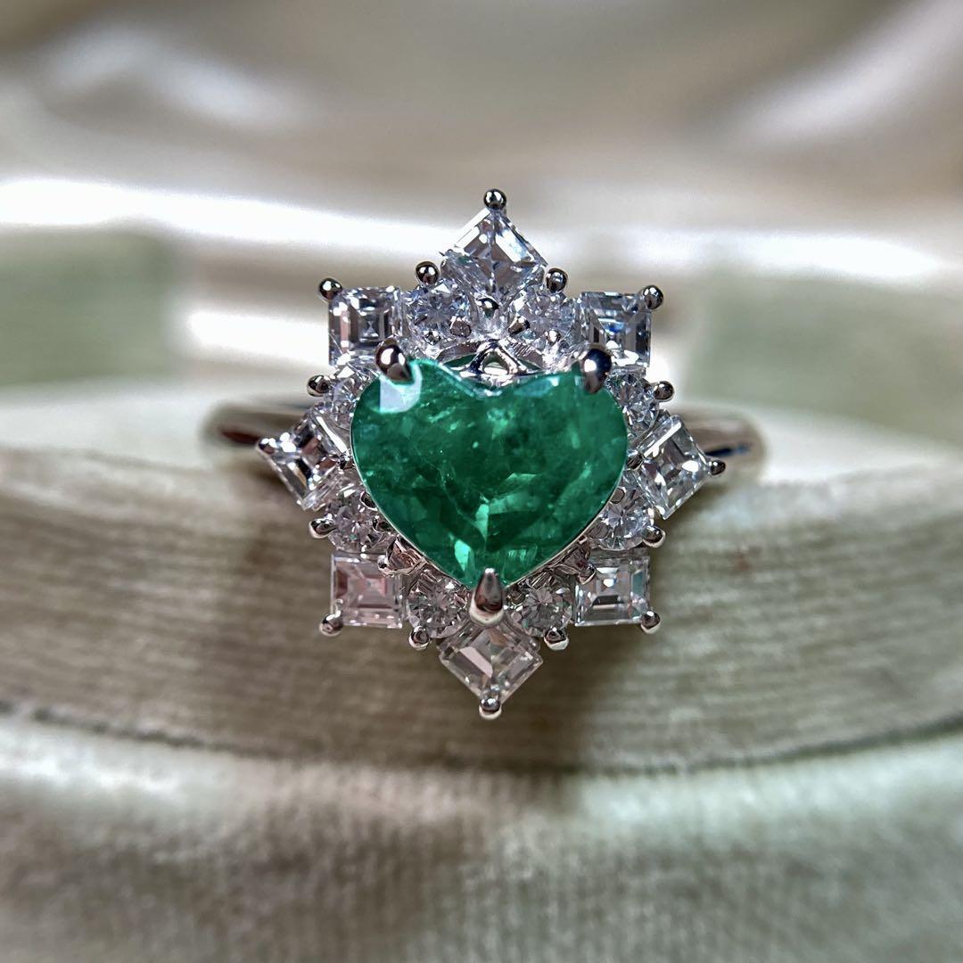 特に様々なカットを施されたダイヤモンドを配置するデザインが素晴らしく、ハートシェイプのエメラルドを組合わせることで、愛らしさと華やかさが見事に調和した、まるでプリンセスの宝石箱から出てきたようなリングに仕上がっています。