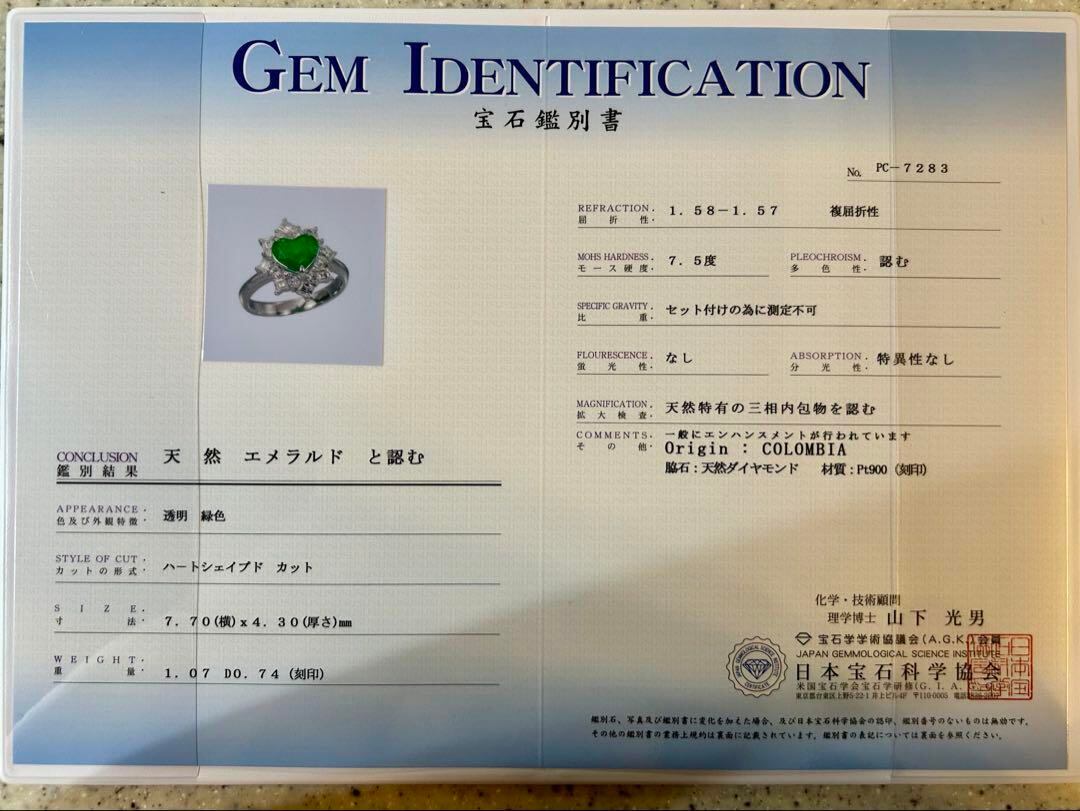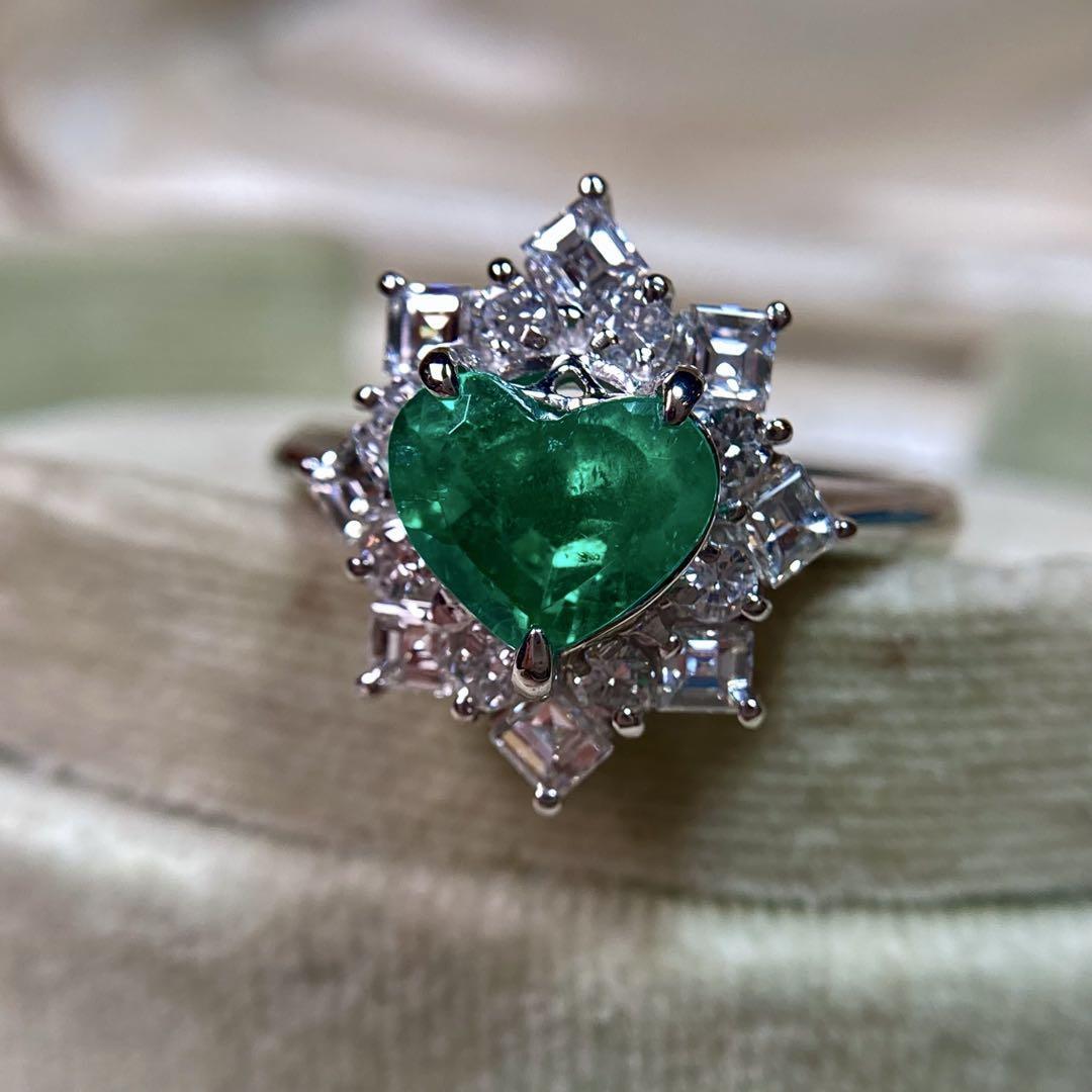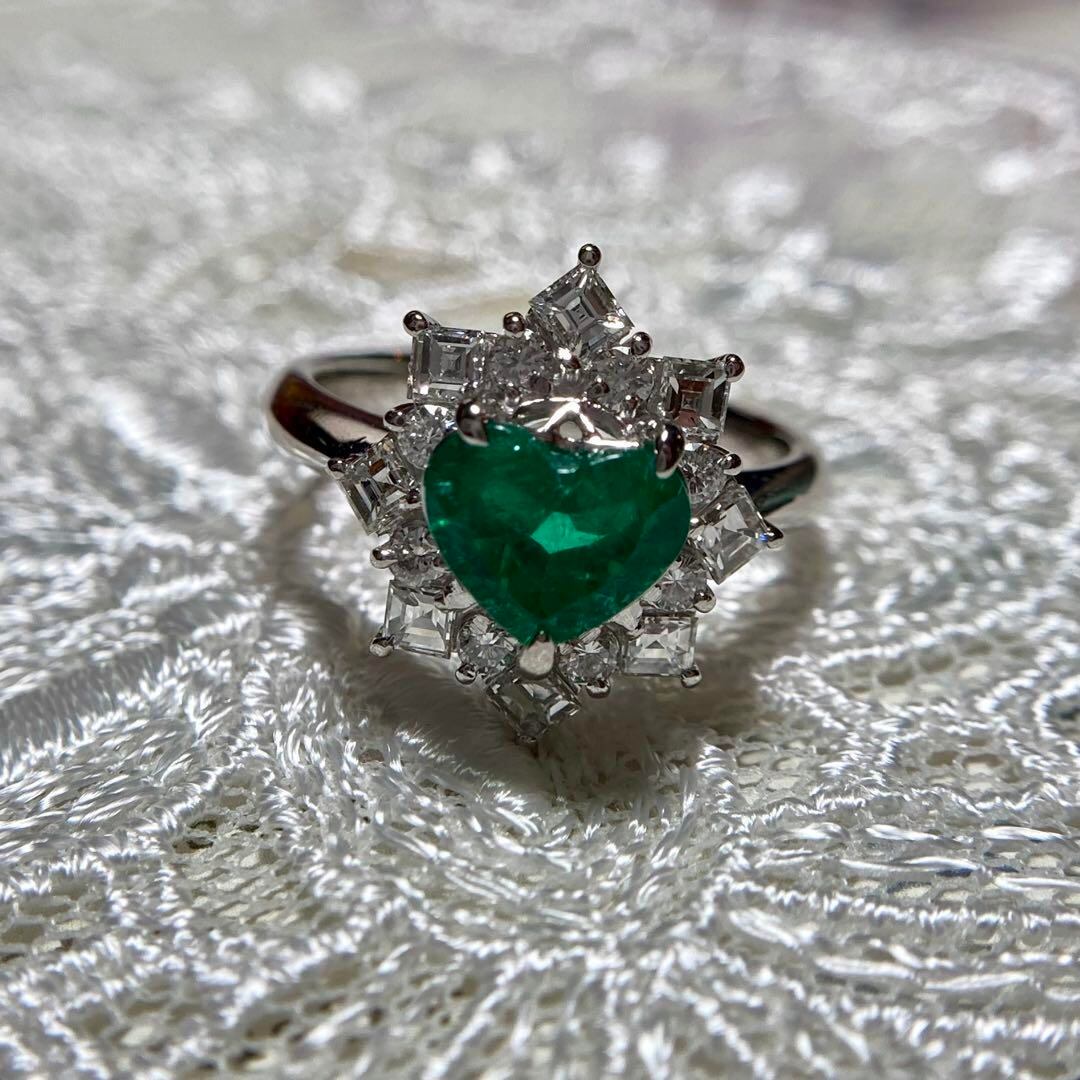 pt900 コロンビア産ハートシェープエメラルド1.07ct D0.74ct