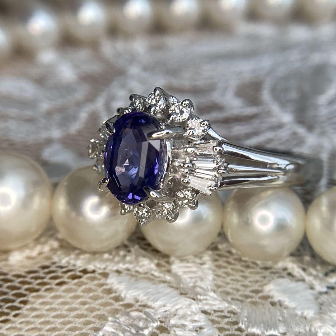 星のようにきらめくその配置が、サファイアの色彩の移ろいをいっそう際立たせています。