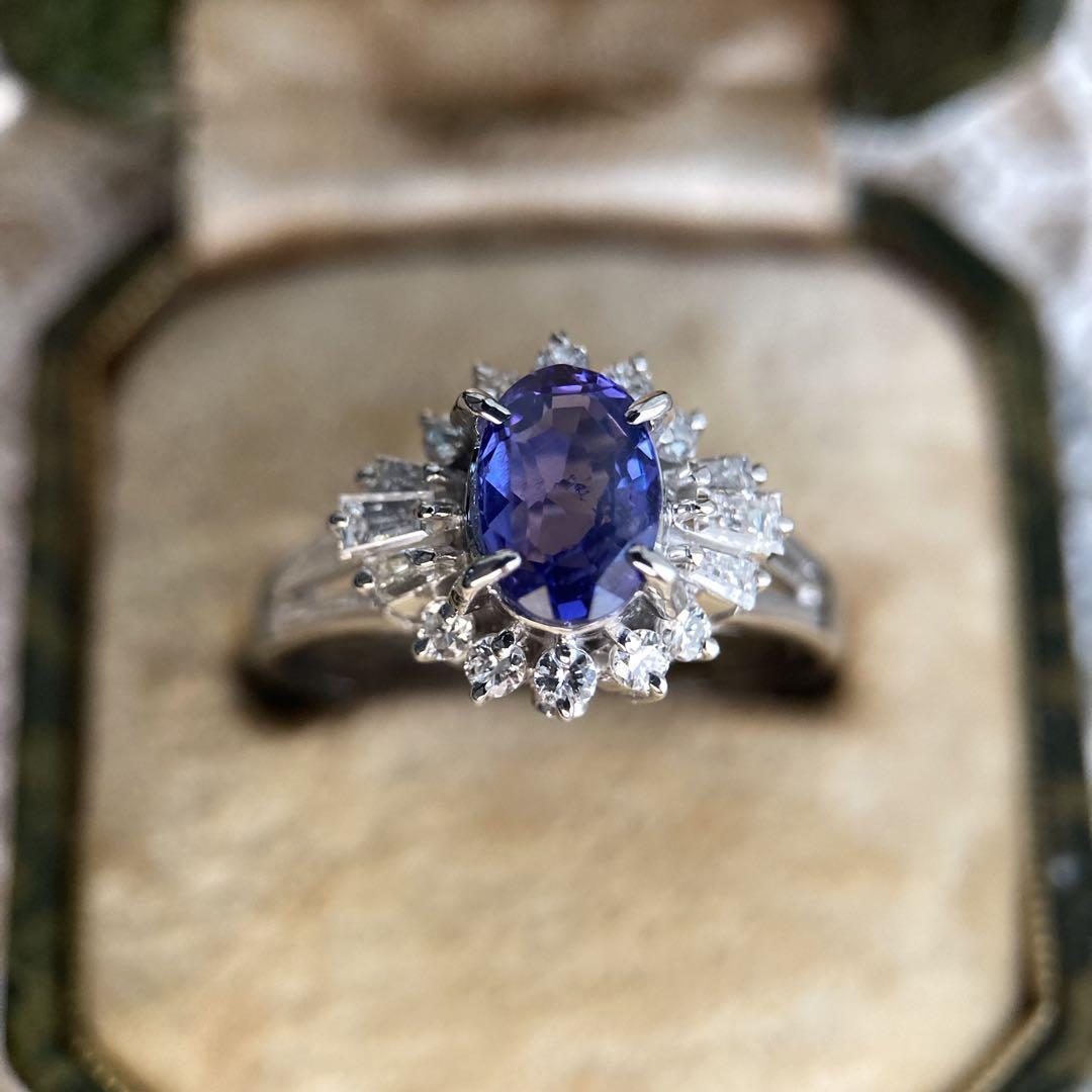 こちらはスリランカ産の非加熱の美しいカラーチェンジサファイアをあしらった、特別なリングです。自然光の下では深みのあるブルーが基調となりつつ、角度や光の加減によってバイオレットがそっと見え隠れする — その移ろいは、まるで宝石が息をしているかのような美しさ。