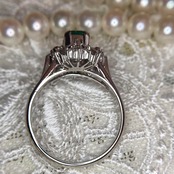 リング自体の作りもとても繊細で美しく、エメラルドの両脇にあしらわれたラウンドメレダイヤモンドは、まるでお花が咲いたような可憐な印象を添え、そこに放射状に広がるテーパーバゲットダイヤが、リング全体に洗練された輝きを与えています。