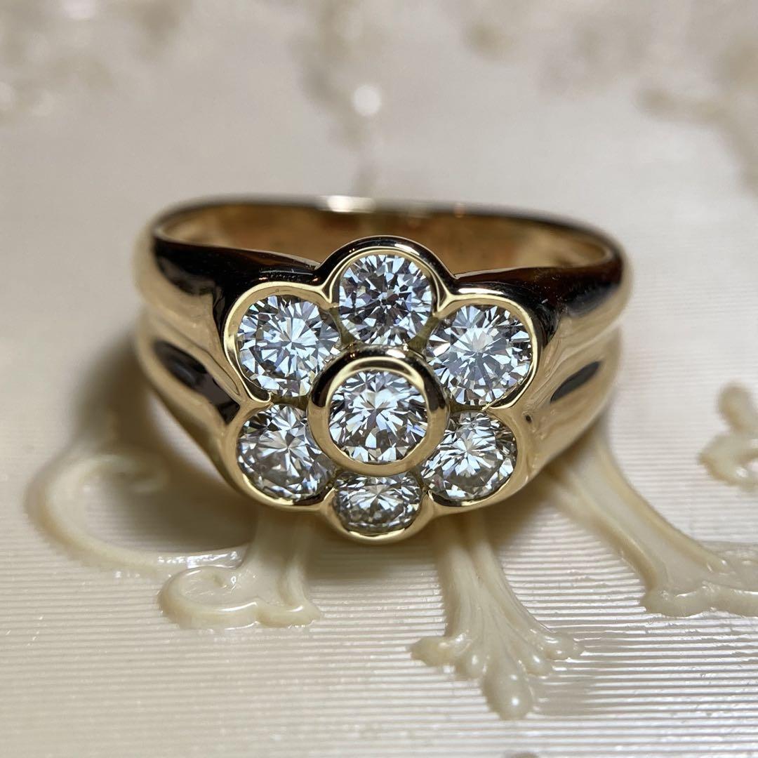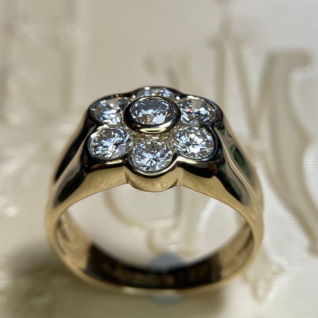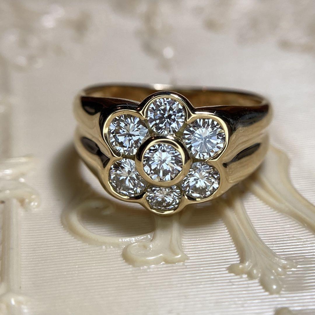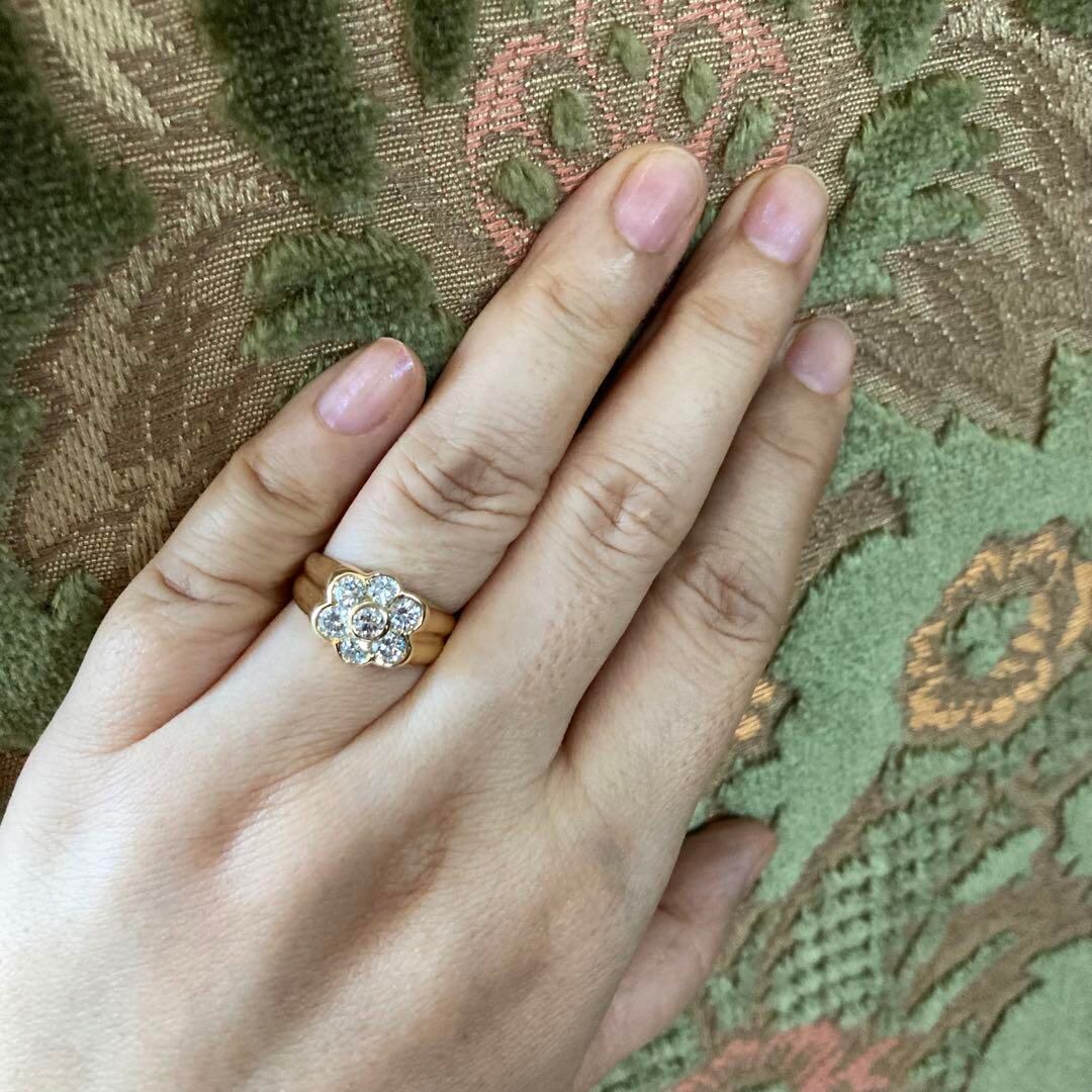 中央に配された大粒のダイヤモンドを中心に、それを囲むように煌めく複数のダイヤモンド。まるで一輪の花が開いたかのような優美なデザインは、身につける指先をこの上なく華やかに、そしてエレガントに彩ります。