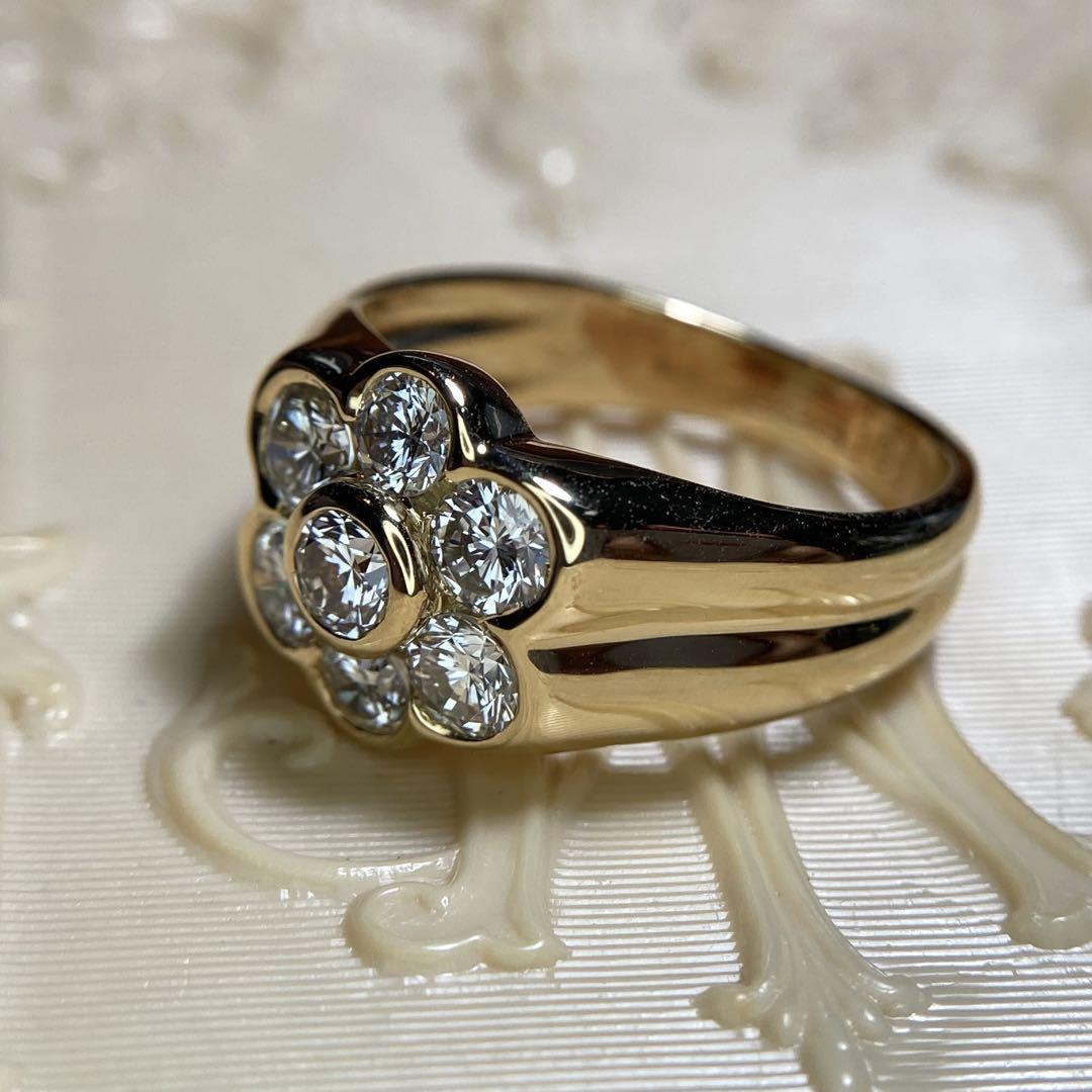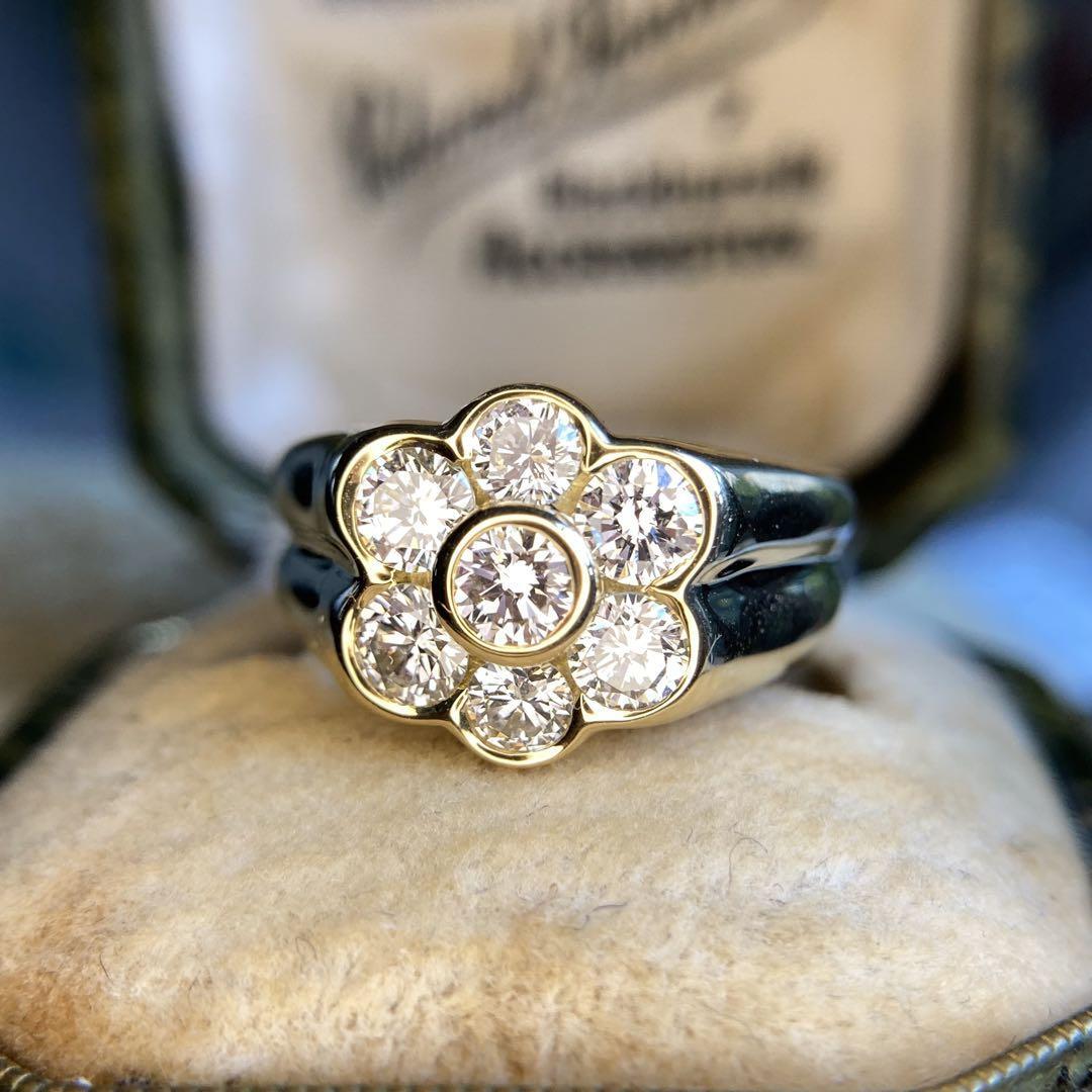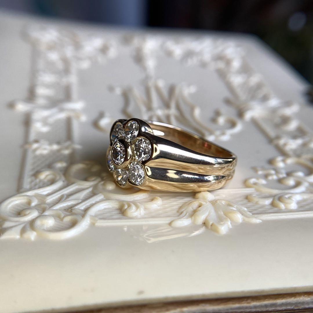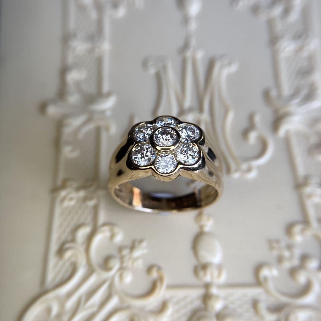 中央に配された大粒のダイヤモンドを中心に、それを囲むように煌めく複数のダイヤモンド。まるで一輪の花が開いたかのような優美なデザインは、身につける指先をこの上なく華やかに、そしてエレガントに彩ります。