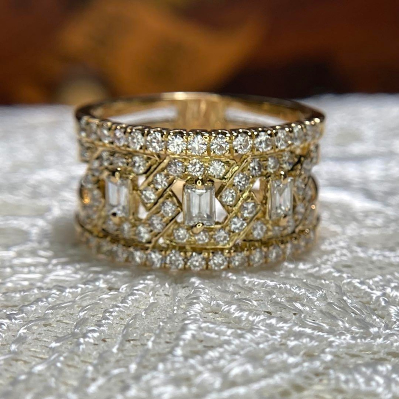 中央には、繊細な地金のラインが織りなす優美な編み込み模様が広がり、そこに等間隔でセットされたバゲットカットダイヤが、まるで光の柱のようにきらめきます。