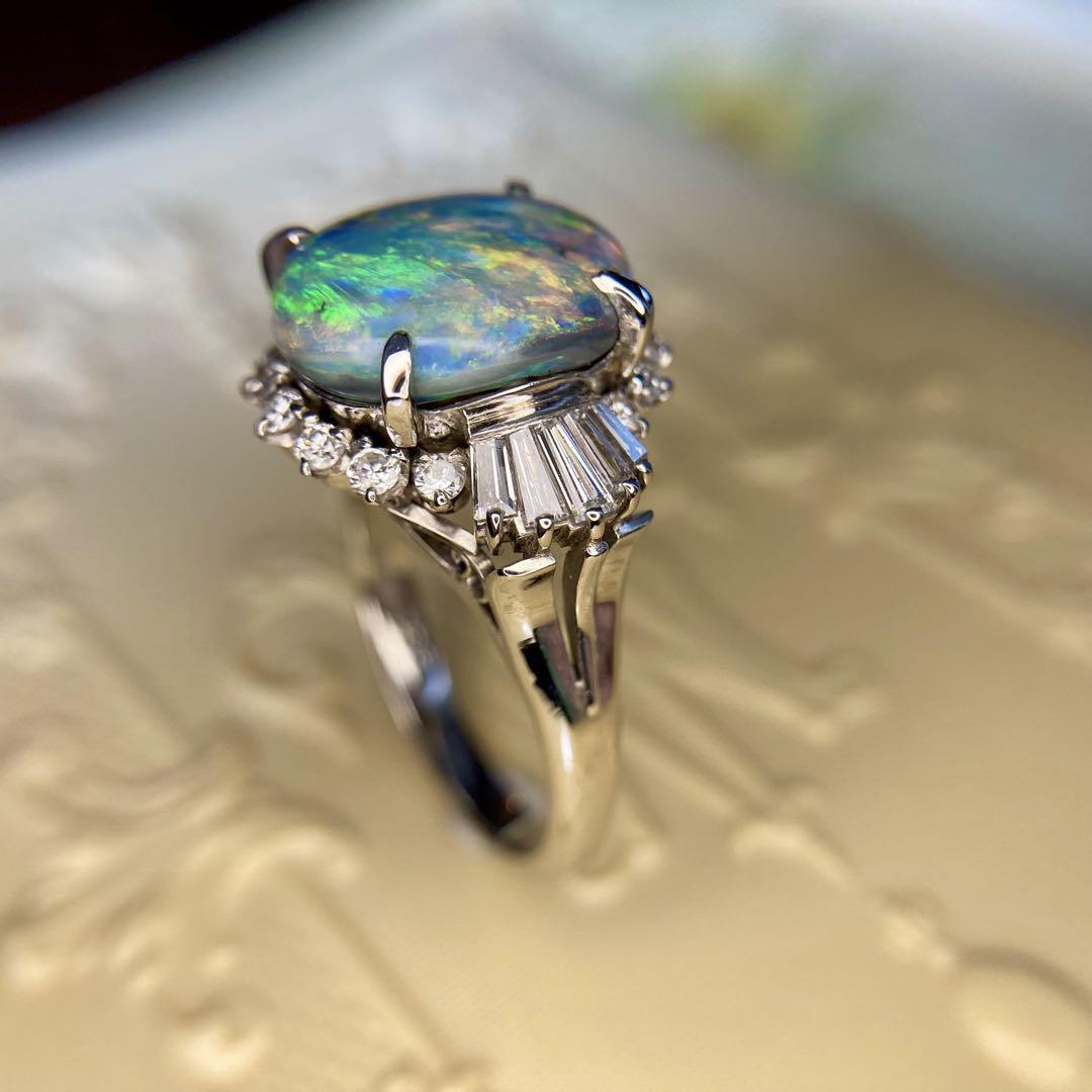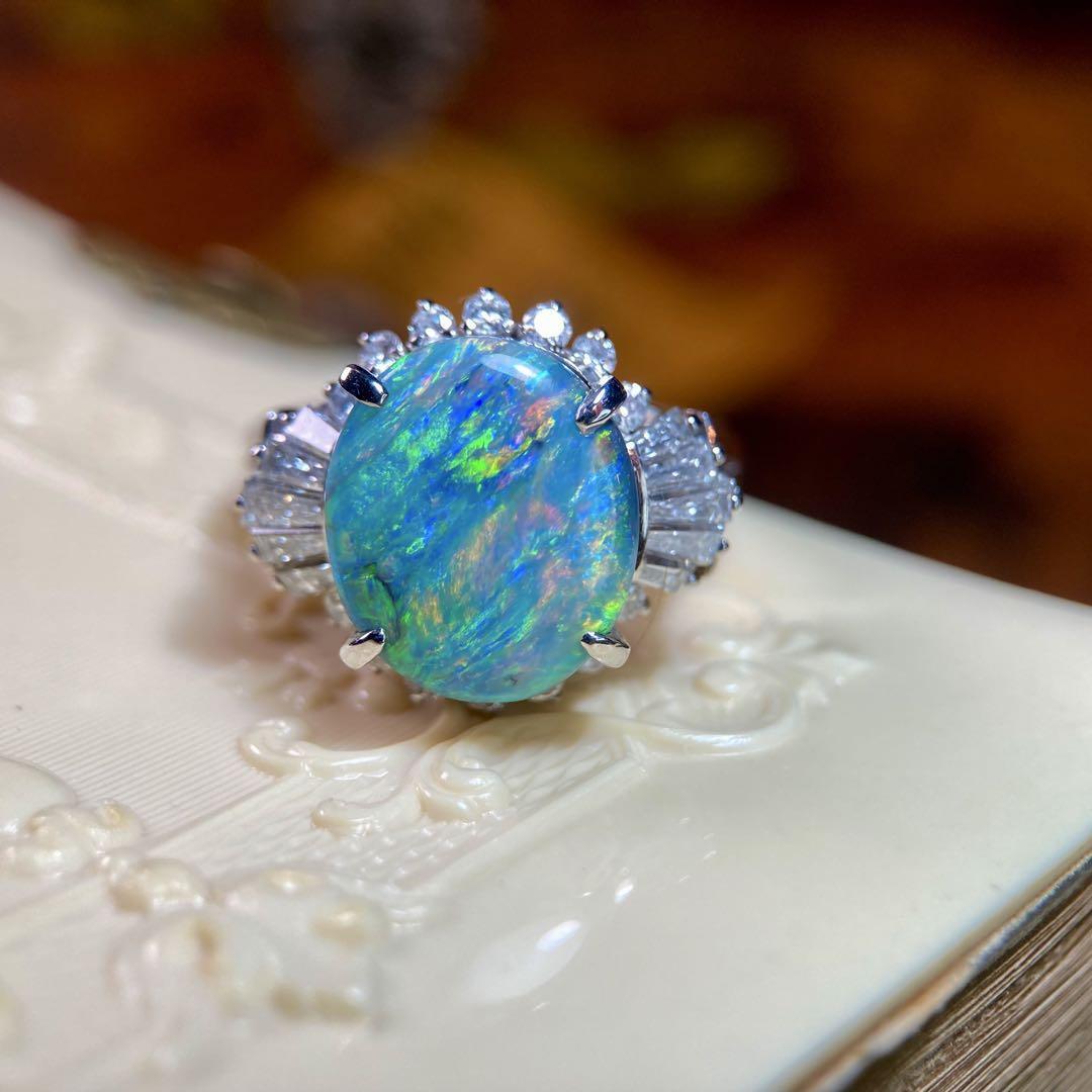 主石は3ctを超える堂々たるサイズを誇り、指元に確かな存在感を与えます。その迫力に加え、取り巻きに配されたダイヤモンドの煌めきが、ブラックオパールの神秘的な色彩をさらに引き立て、ジュエリー全体を華やかに演出しています。