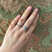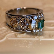 そして、エメラルドを支えるリングのデザインは、アンブローズの真骨頂。お写真の指輪は、リングの腕の部分にヴィクトリア朝後期やアール・ヌーヴォーを思わせる繊細な装飾も見られますが、全体的な印象は、直線と幾何学的なカットが特徴のアール・デコに近いように思われます。現代のジュエリーでは、このアール・デコのデザインをリバイバルさせたものが多く作られています。プラチナとゴールドのコンビネーションに、サイドを飾るダイヤモンドの煌めき、そして繊細な透かし模様が織りなす荘厳なデザインは、まさに職人技の極みです。このリングを身につけた瞬間、エレガントで上品なオーラがあなたを包み込み、日常のどんなシーンも特別な瞬間に変えてくれます。