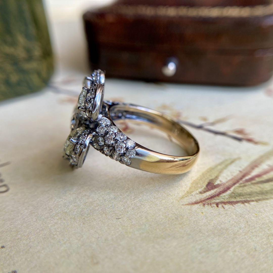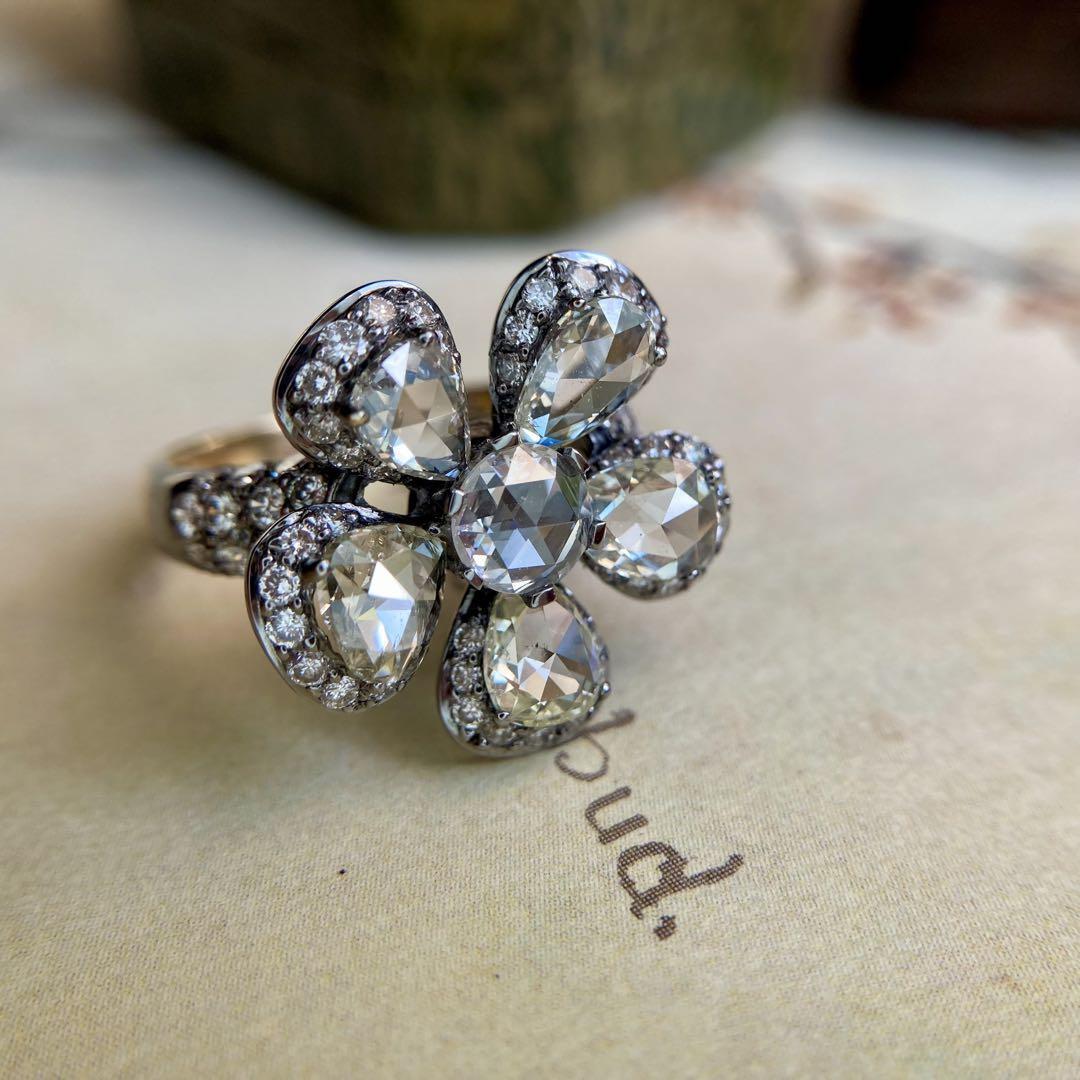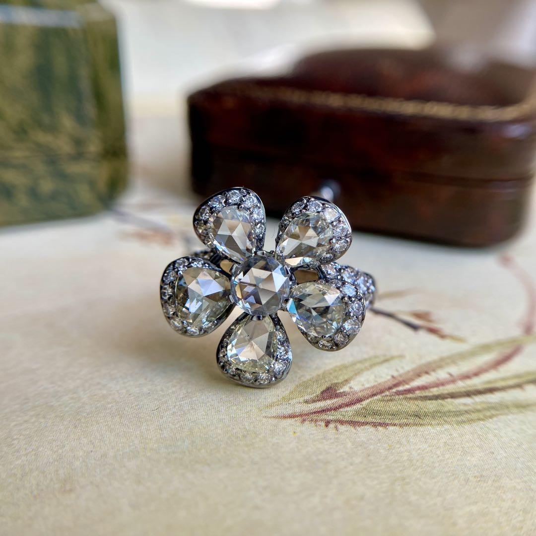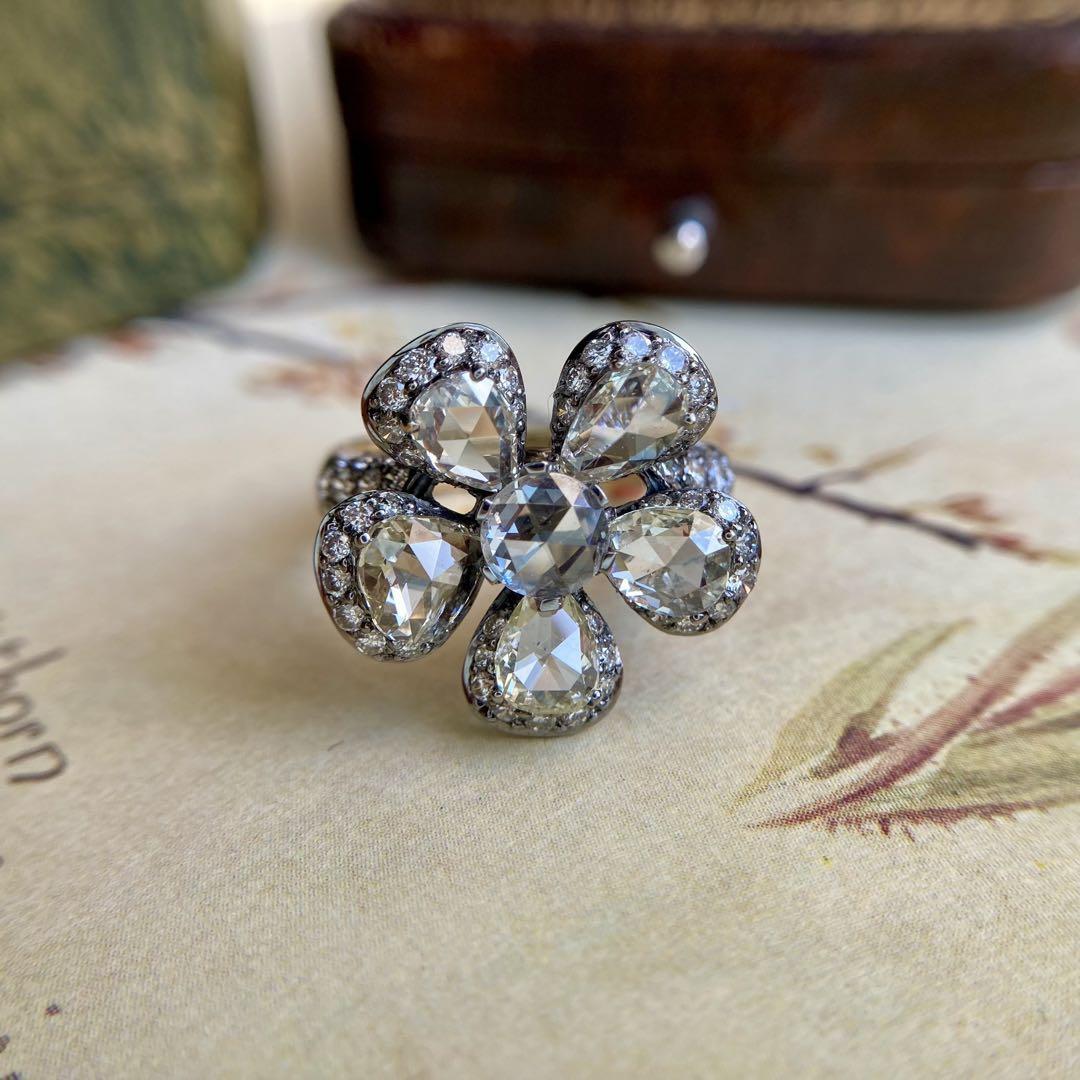 中心には、アンティークジュエリーに多用されるローズカットダイヤモンドを贅沢にセッティング。その奥ゆかしく深みのある輝きが、リングにヴィンテージの趣を添えています。さらに、花びら部分にはペアシェイプカット、縁取りにはラウンドブリリアントカットのダイヤモンドが隙間なく敷き詰められており、どの角度からも立体感のある眩い輝きをお楽しみいただけます。