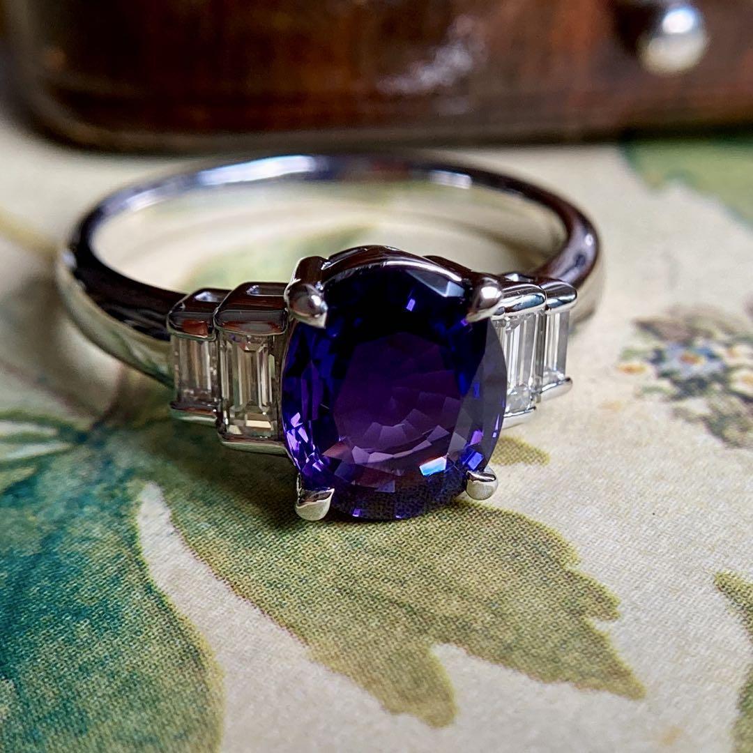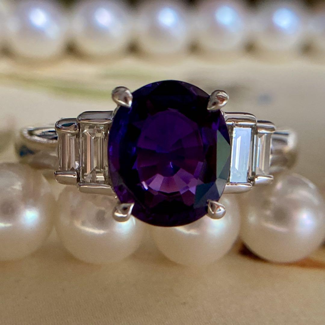 光を受けるたびに表情を変える、見事なカラーチェンジサファイアのリングです。