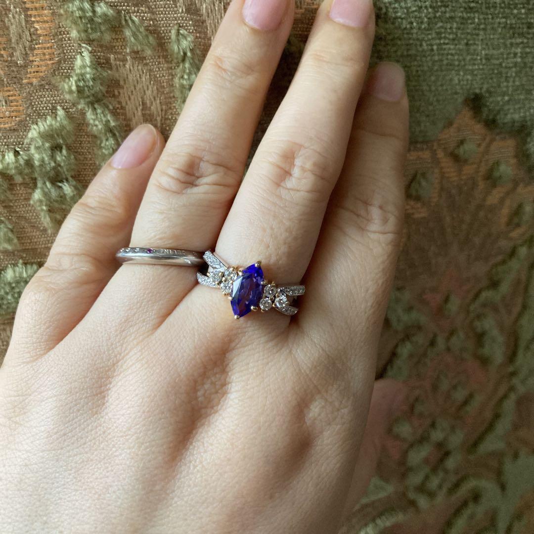 センターに配されたマーキスカットのタンザナイトは、シャープでありながら気品に満ち、指先をすらりと美しく見せてくれる存在感を放ちます。その両脇を彩るダイヤモンドは、満天の星々を思わせるようにきらめき合い、タンザナイトの青紫の光を一層引き立てています。