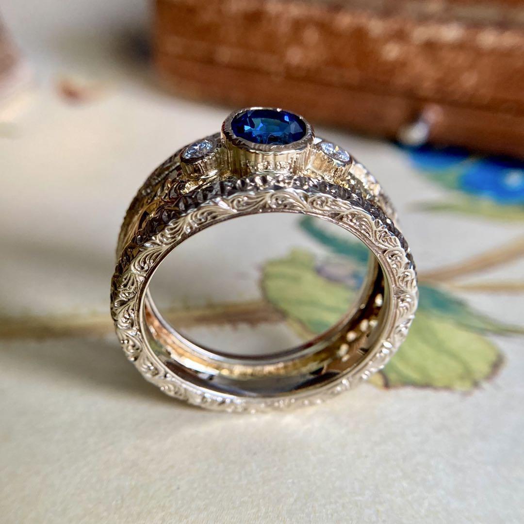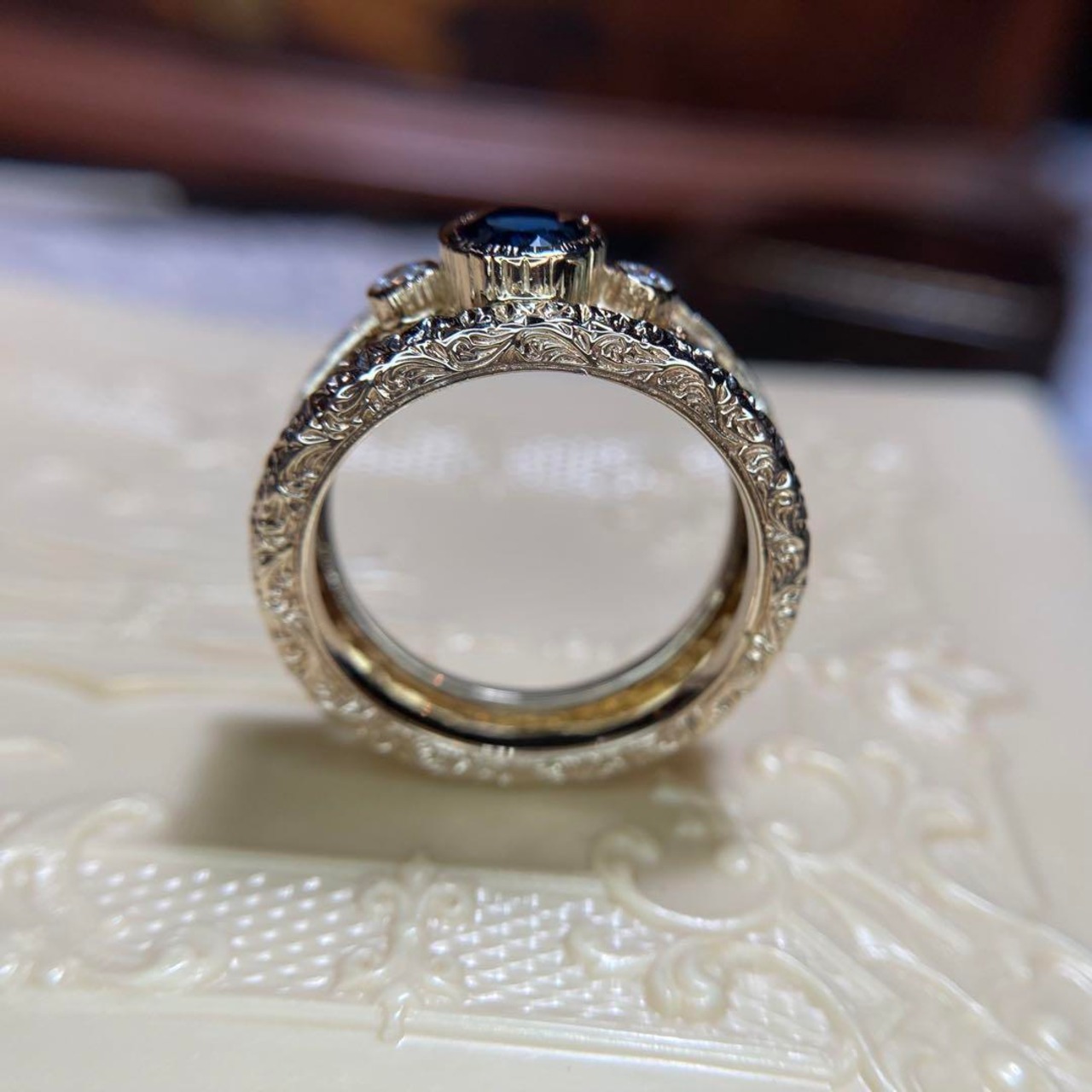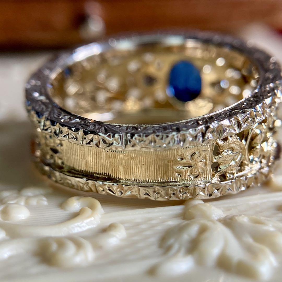 枠の縁やミル打ち(ミルグレイン)にはホワイトゴールドを用いることで、サファイアの鮮烈な青をクリアに際立たせ、リング全体をシャープに引き締めています。対照的に、中央の幅広な部分には温かみのあるイエローゴールドが大胆に配され、その表面には唐草模様(スクロール)の精緻な彫金が施されています。さらに透かしの技法を組み合わせることで、光を巧みに取り込み、立体的な陰影と奥から湧き上がるような輝きを実現しています。