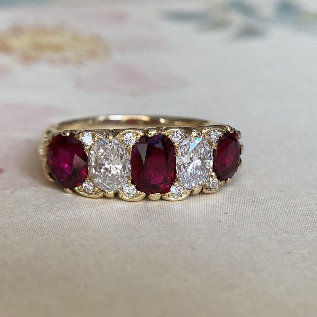 そしてこちらはヴィクトリア様式の伝統的なリング。深紅のルビーと輝きに満ちた大粒ダイヤモンドが交互に並び、合計5石が華やかに競演します。さらにその間を埋めるように散りばめられたメレダイヤが、光を途切れさせることなく指先に煌めきの流れを描き出します。選び抜かれた宝石はいずれも透明度が高く、光を取り込みやすいクリアな輝きが際立っています。アセーマーク、レーターマークから、ロンドンで1994年に作られたことがわかる一品です。