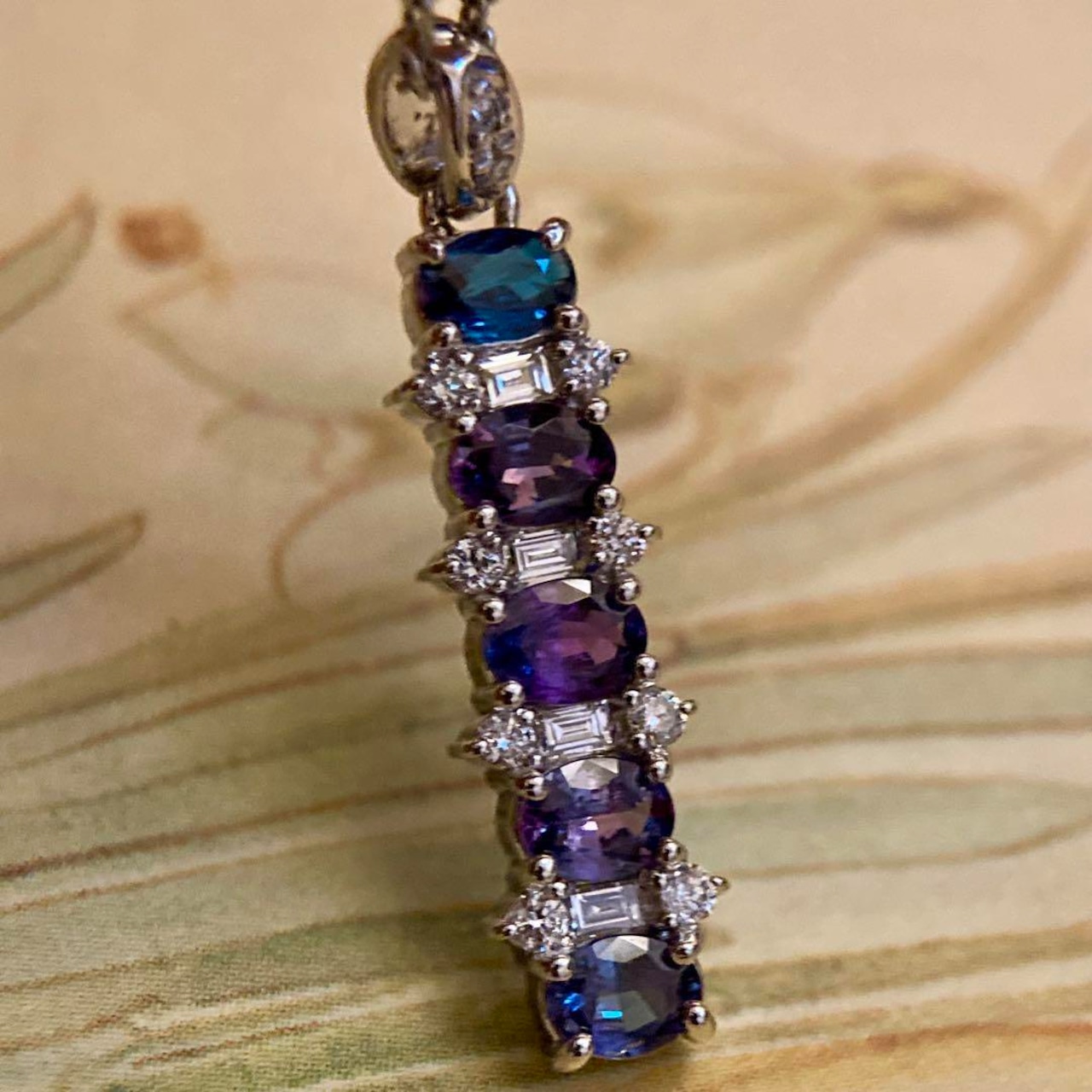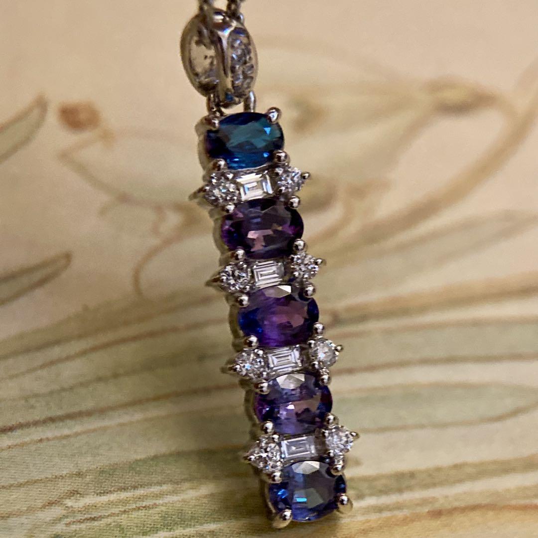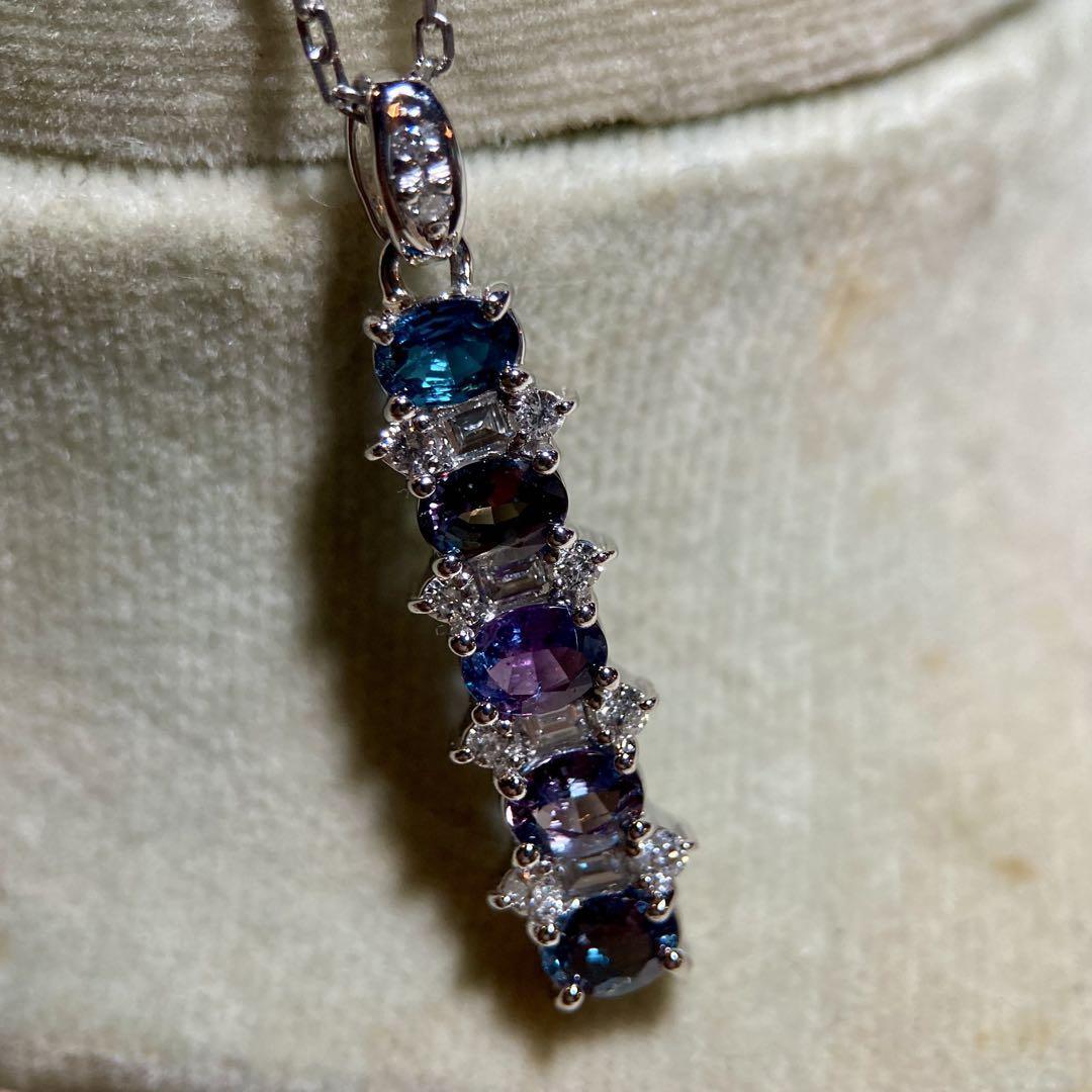 間に添えられたダイヤモンドがアレキサンドライトの色変化をより際立たせ、光の反射によって胸元に華やかな立体感を生み出しています。