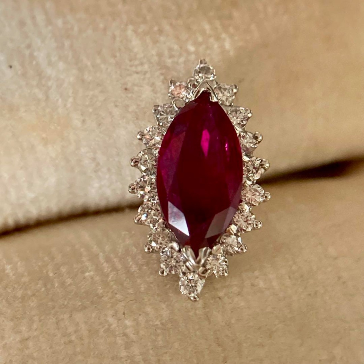 取り巻くダイヤモンドの一粒一粒が、ルビーの華やかさをさらに引き立て、凛とした美しさを際立たせています。