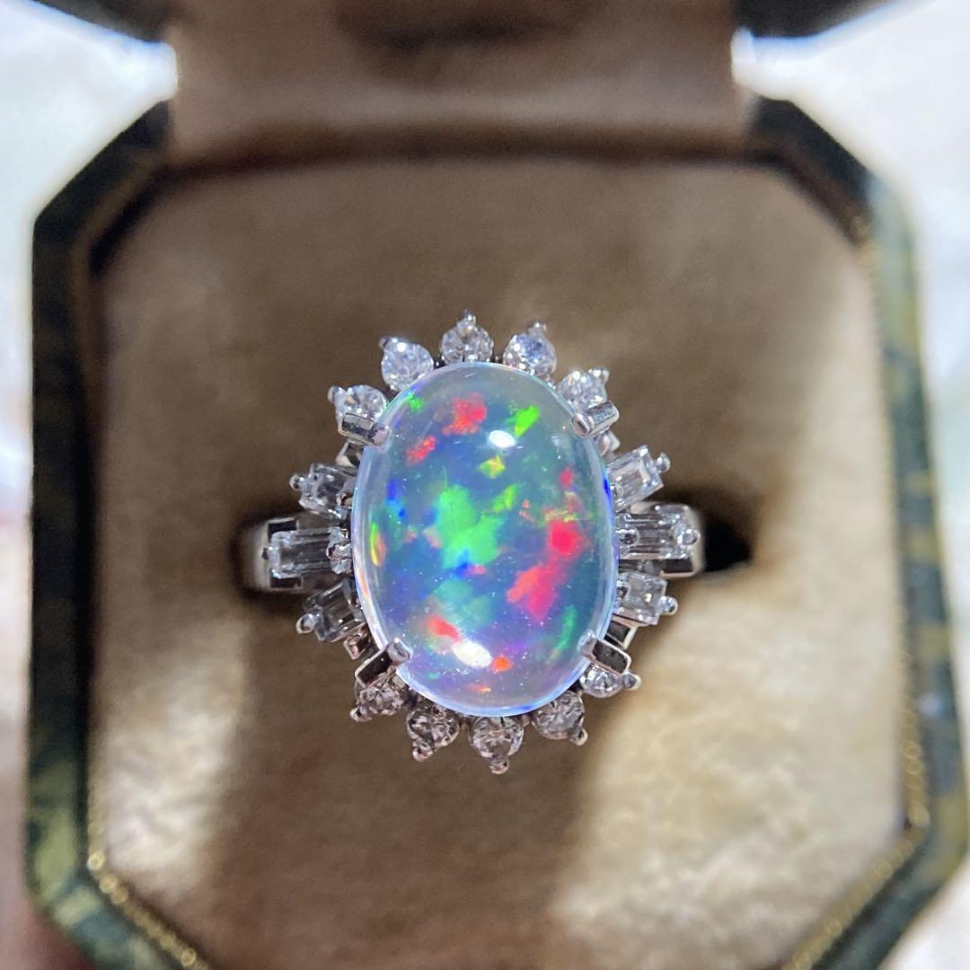 【静寂の水に宿る炎】ウォーターオパール ダイヤモンドリング Pt900 昭和レトロ