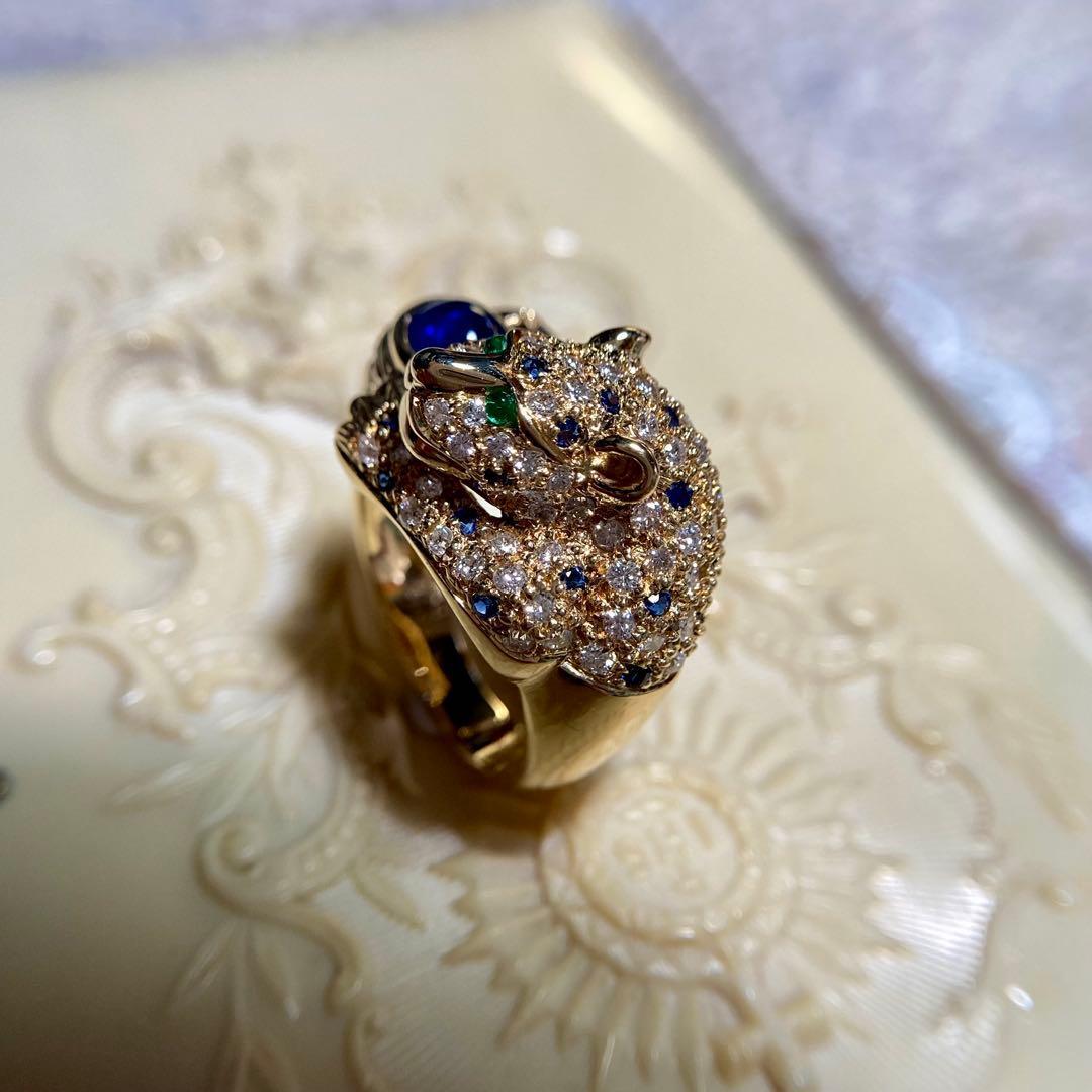 デザインの核となるのは、艶やかな光沢を放つ大粒のカボションカットサファイアです。この深く美しいブルーが、リング全体に高貴な印象を与え、パンサーの逞しさを引き立てています。さらに、体全体に散りばめられたサファイアとダイヤモンドのグラデーションが、まるで生きているかのような毛並みの立体感を表現し、宝石の輝きを最大限に引き出しています。そして、目の部分に嵌め込まれた印象的なエメラルドが、パンサーに生命を吹き込み、非常に魅力的な表情を与えています。