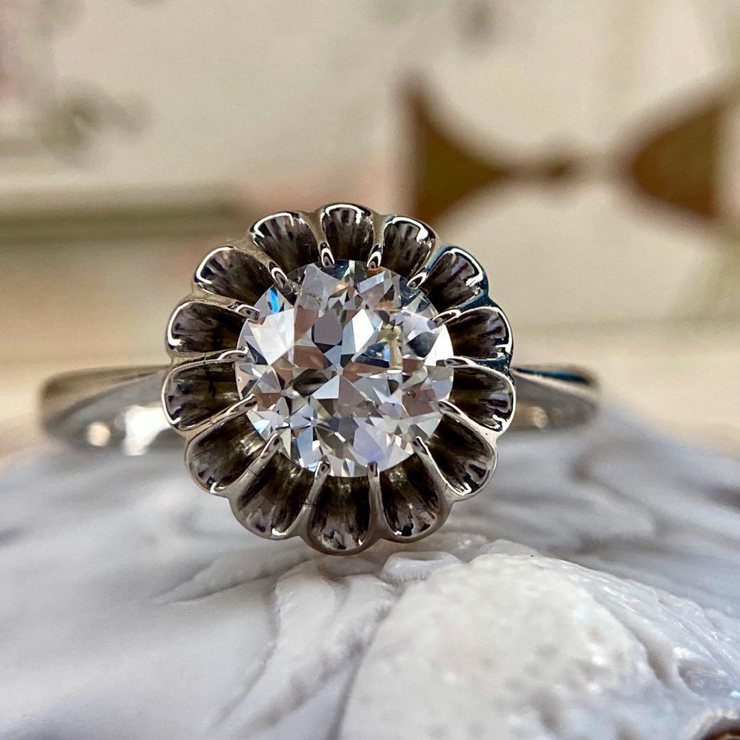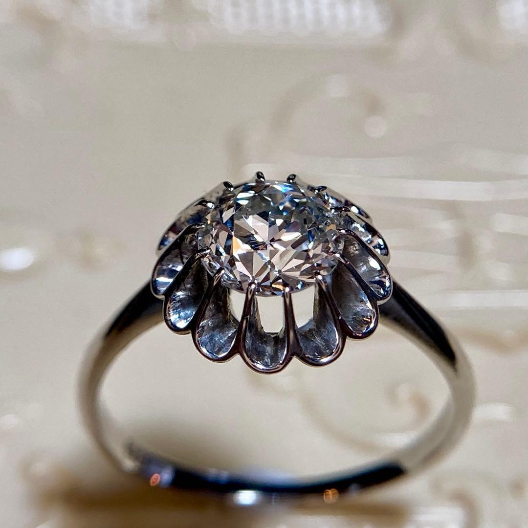 中央にセッティングされたダイヤモンドは、現代の鋭い輝きとは異なり、ファセットが大きくカットされたオールドヨーロピアンカットに近い、アンティークならではの奥深い煌めきを湛えています。この落ち着いた、どこかノスタルジックな輝きこそが、現代のジュエリーにはない、大正ロマンを感じさせる最大の魅力です。プラチナの地金に映えるその佇まいは、指元に本物の歴史と物語を添えてくれます。