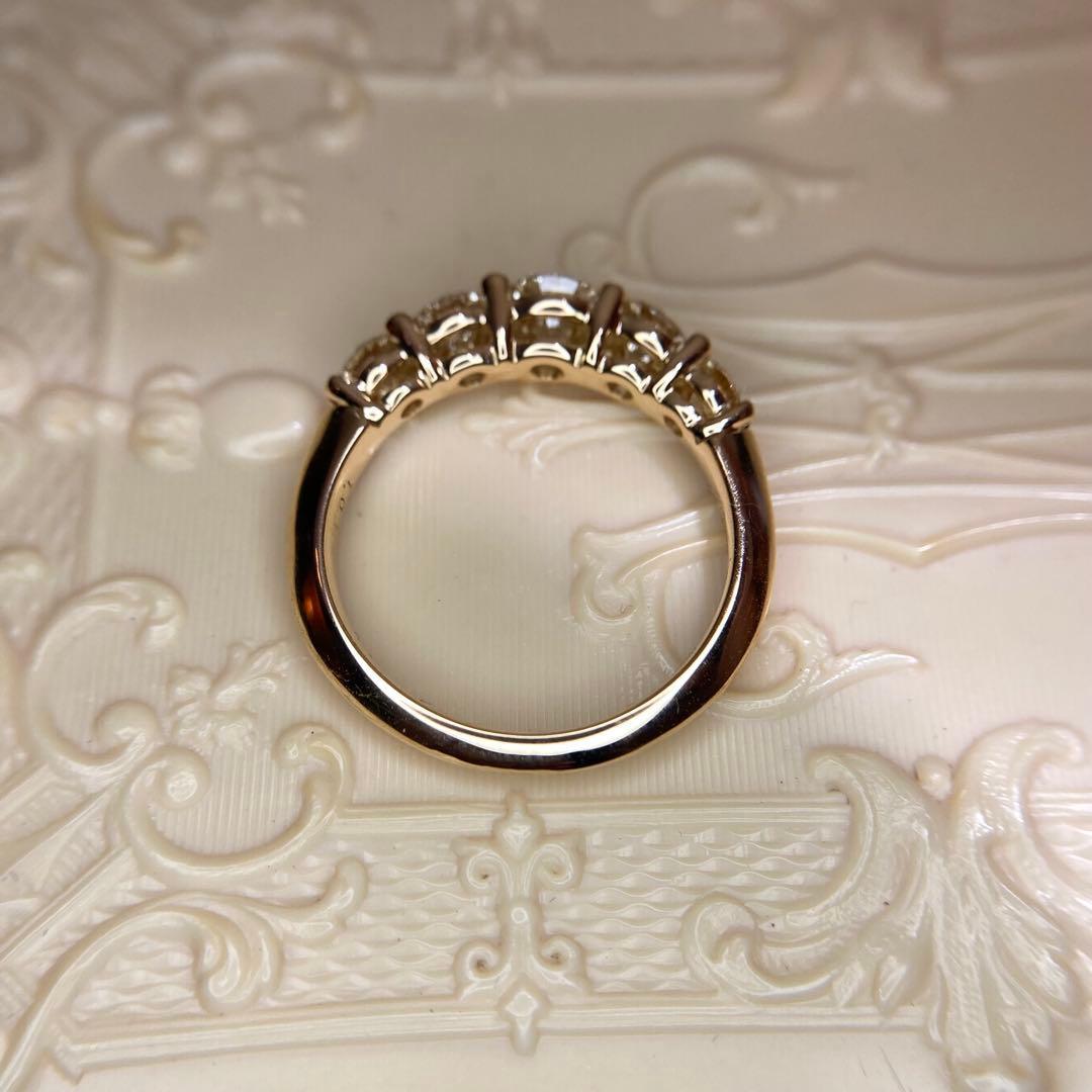まさにそのクィーンの哲学が体現されたのが、この5石のダイヤモンドリングです。地金には温かみのあるイエローゴールド(K18YG)が用いられ、合計1.01ctもの上質なダイヤモンドが贅沢に連なっています。このリングの最大の魅力は、ダイヤモンドを単調に並べるのではなく、中央の石をわずかに大きく際立たせ、両脇に向かって自然なグラデーションで配置している点にあります。この計算された配置により、指元に一本着けるだけで圧倒的な存在感と奥行きが生まれます。