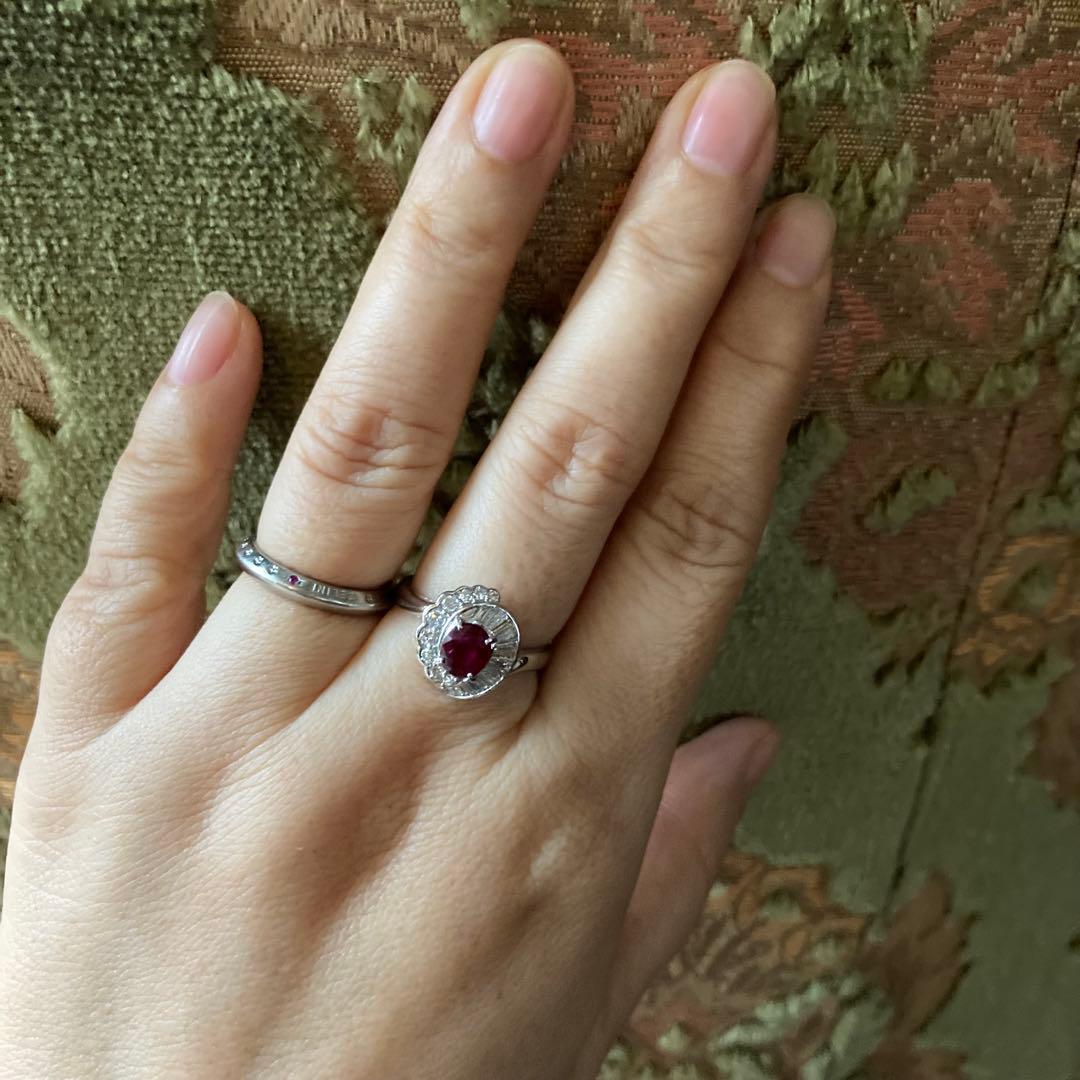 枠にはプラチナ900を使用。凛とした白の光が、ルビーの赤をより鮮烈に見せ、宝石の持つ美しさを正面から受け止めて引き立ててくれます。華美になりすぎず、それでいて確かな格を湛えた佇まいは、大人の女性が堂々と主役として身に着けられる一品と言えます。