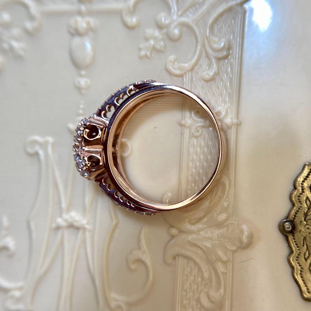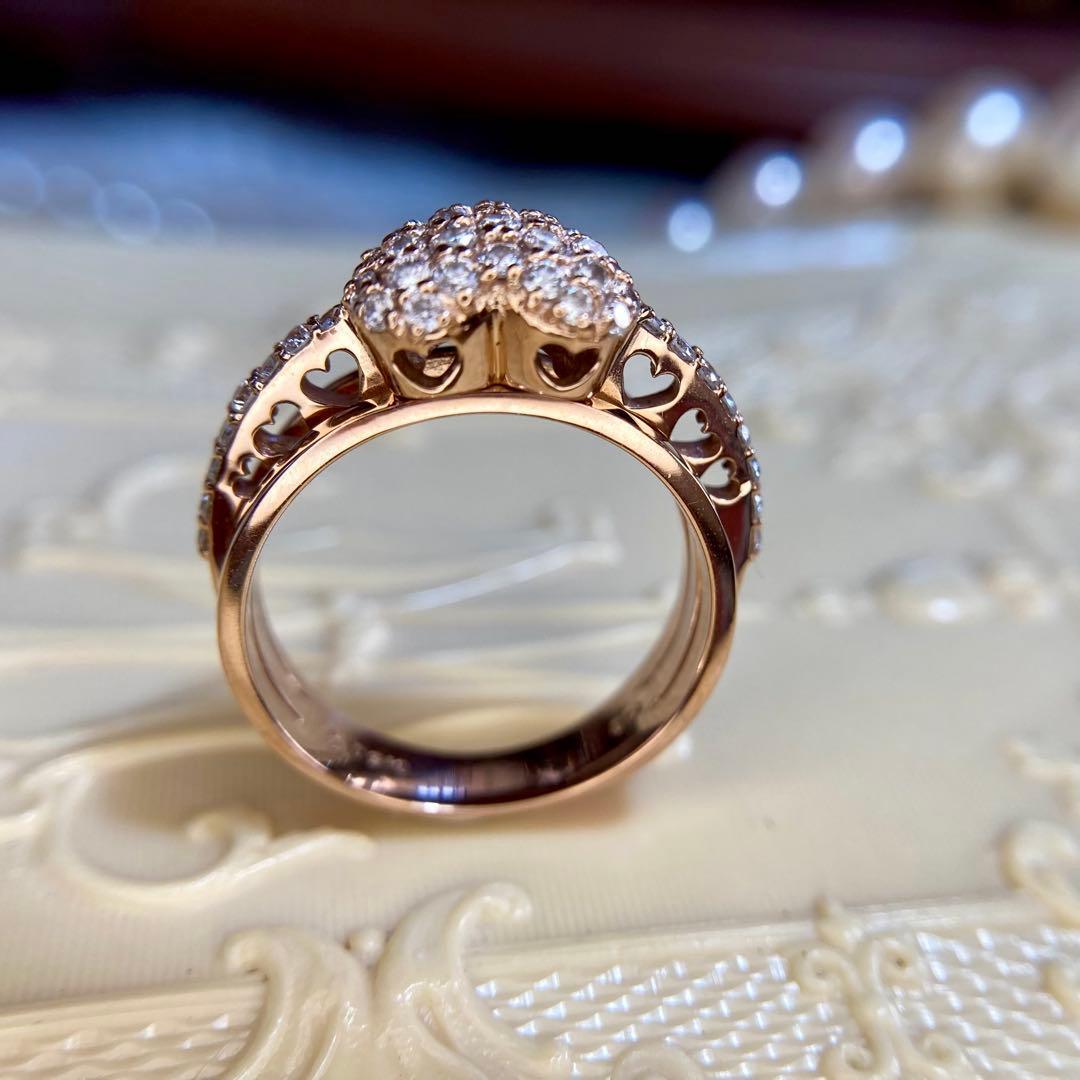 しかし、このリングの本当の魅力は、横から見たときの細部に宿る可愛さにあります。中央のハートはもちろん、両脇のダイヤモンドラインの土台となる部分にも、いくつものハートの透かし模様が施されています。この立体的なデザインと、光を透過させる細工によって、横顔までどこから見ても可愛らしさが溢れ出しています。
