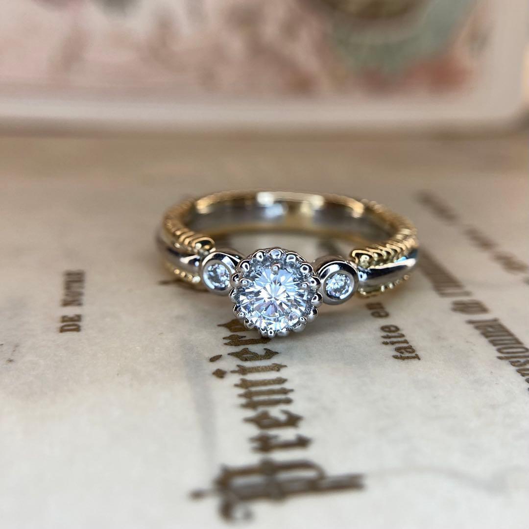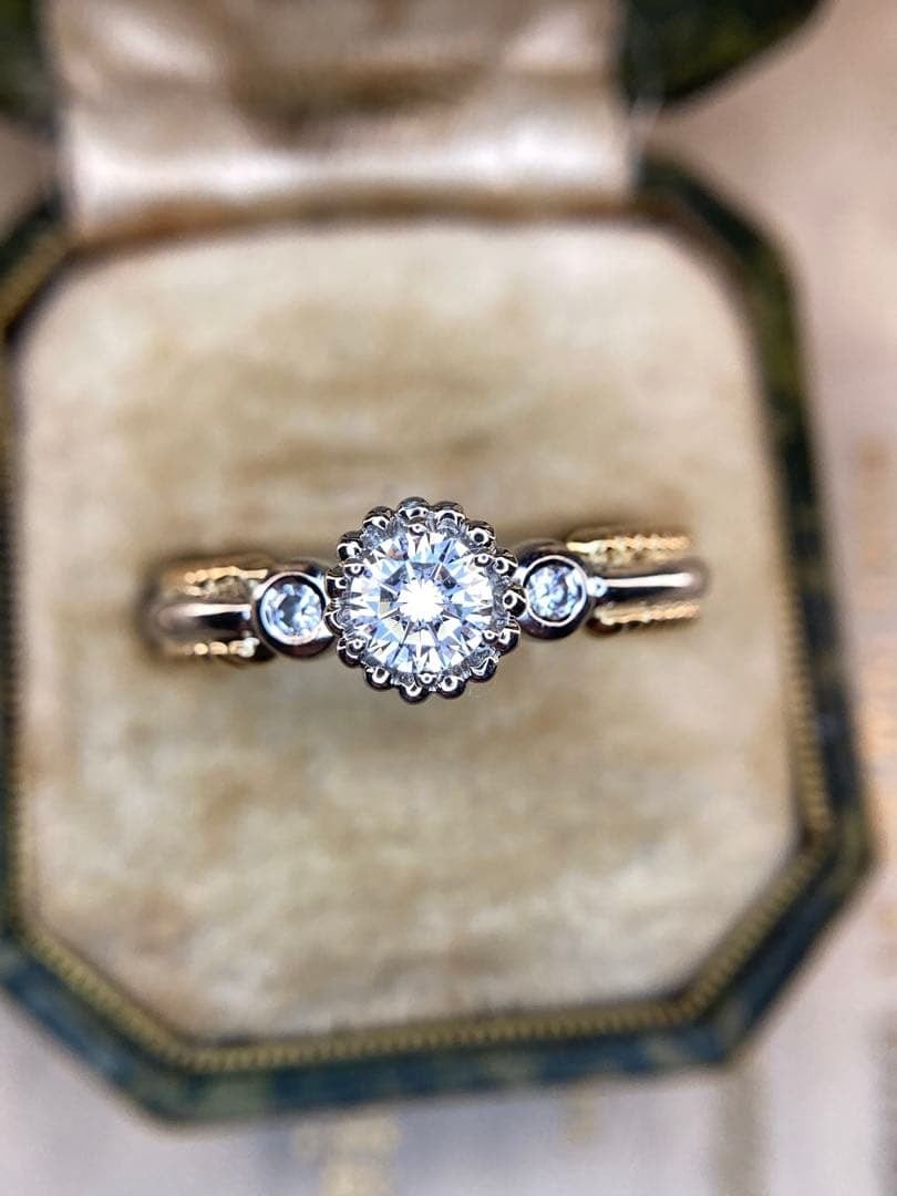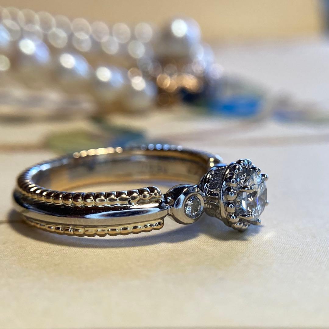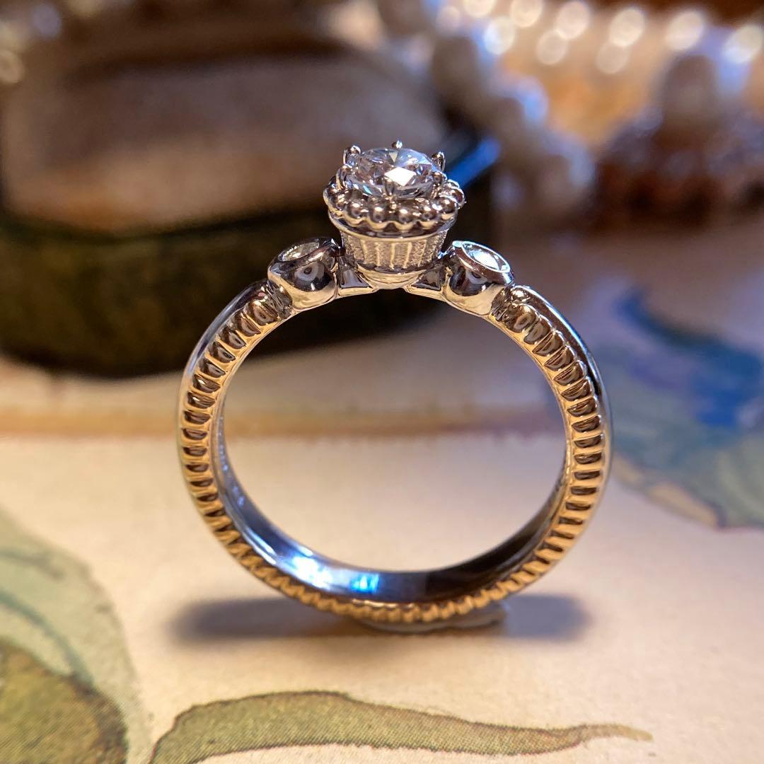 このリングの最も特筆すべき技術が、アーム部分やセンターのダイヤモンドの周囲に施された、驚くほど細かな粒金細工です。