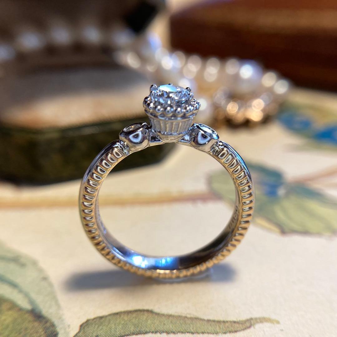 中央のダイヤモンドを包み込む石座は、細密な粒金細工によって表現された、まさに「クラウン」のような荘厳なデザインです。このクラシカルでロマンティックなモチーフは、石川暢子先生が愛した「西洋の様式美」を連想させます。