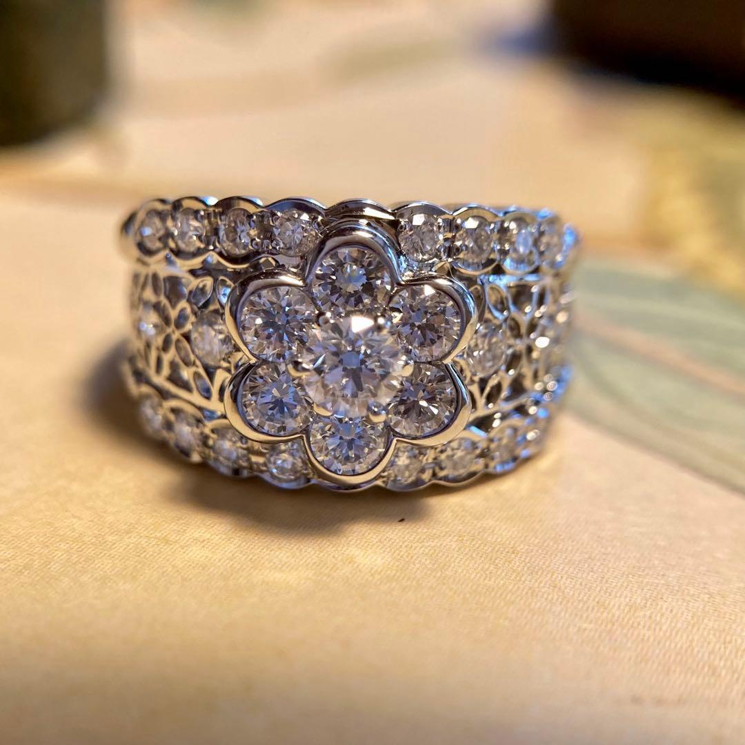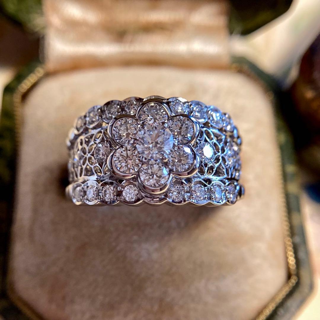 リング正面には、大小のダイヤモンドを精巧に組み合わせて一輪の花を象ったフラワーモチーフ・クラスターを配置。