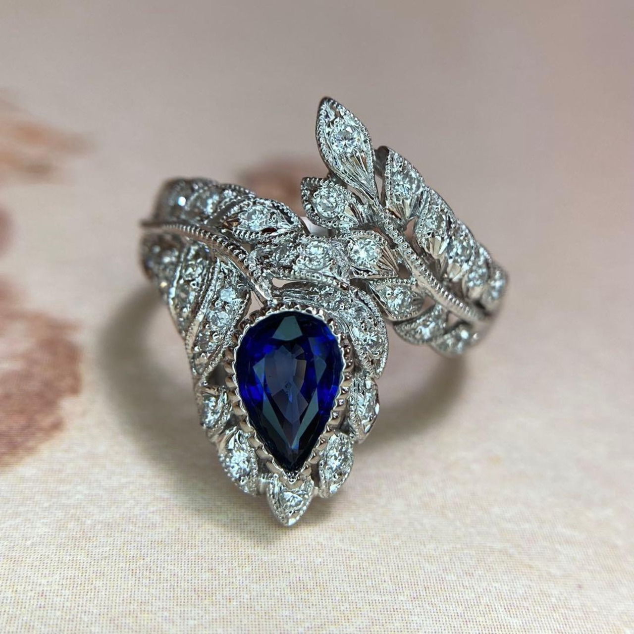 さらに孔雀の羽を思わせるラインに沿って散りばめられたダイヤモンドは、一つひとつ厳選された高品質の石を使用。緻密なパヴェセッティングによって、ダイヤの繊細な煌めきがサファイアの深い青を引き立て、リング全体に華やかさと立体感を与えています。