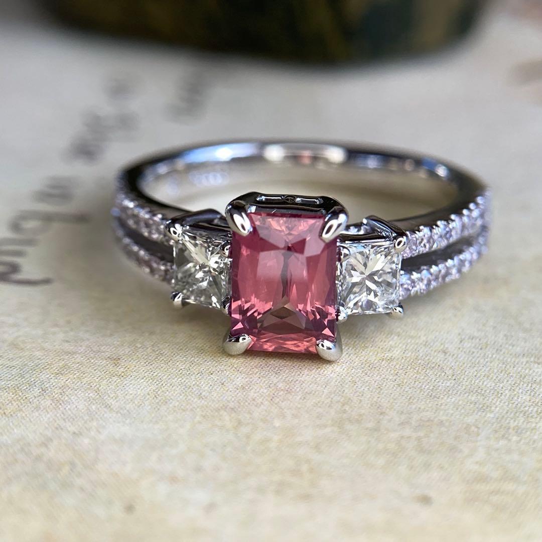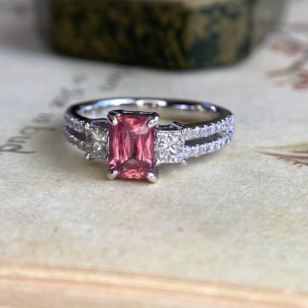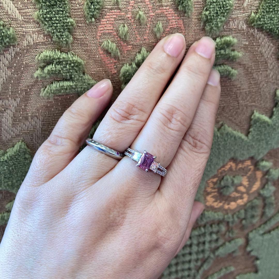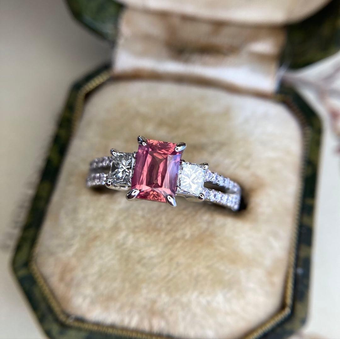 メインを飾るのは、知的なスクエアカットのパパラチアサファイア。サイドには凛とした輝きのプリンセスカットダイヤモンドを添え、アームに並ぶダイヤがその華やぎを一層引き立てます。