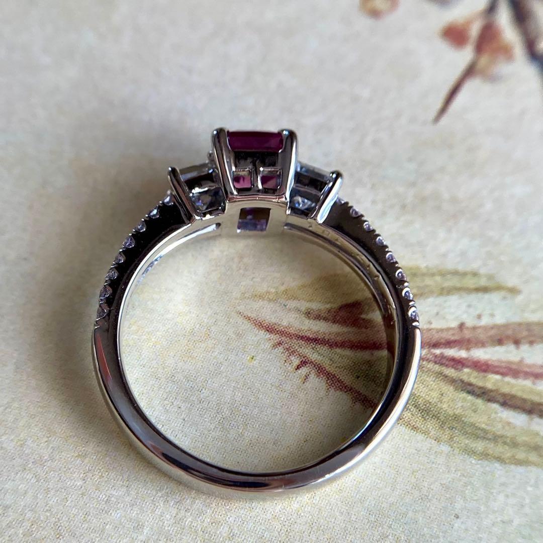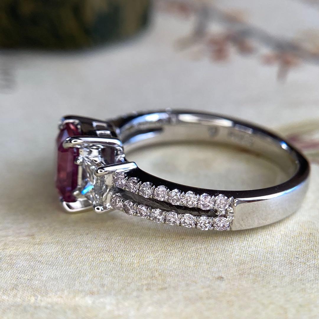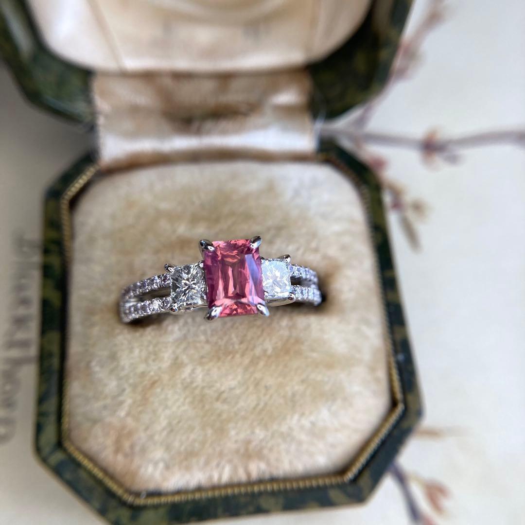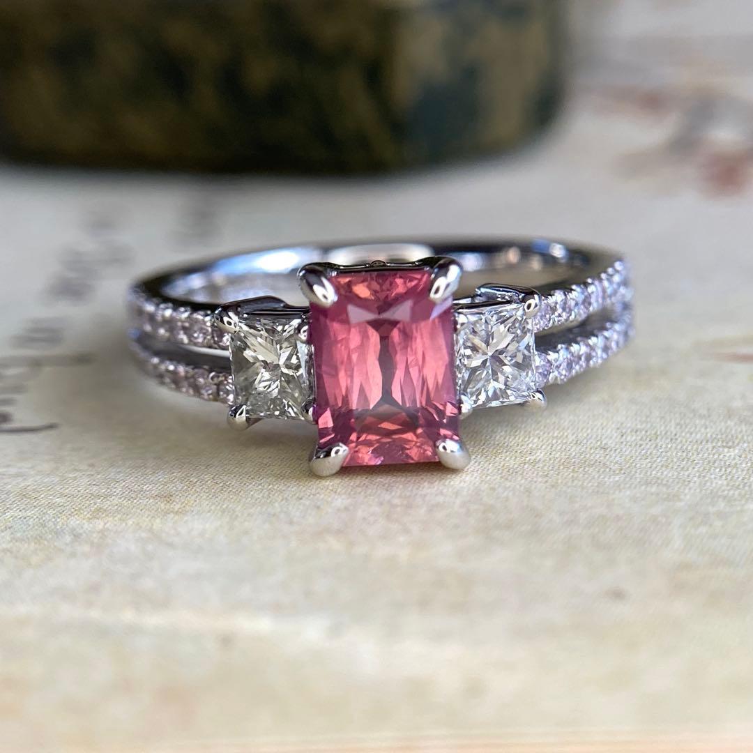メインを飾るのは、知的なスクエアカットのパパラチアサファイア。サイドには凛とした輝きのプリンセスカットダイヤモンドを添え、アームに並ぶダイヤがその華やぎを一層引き立てます。