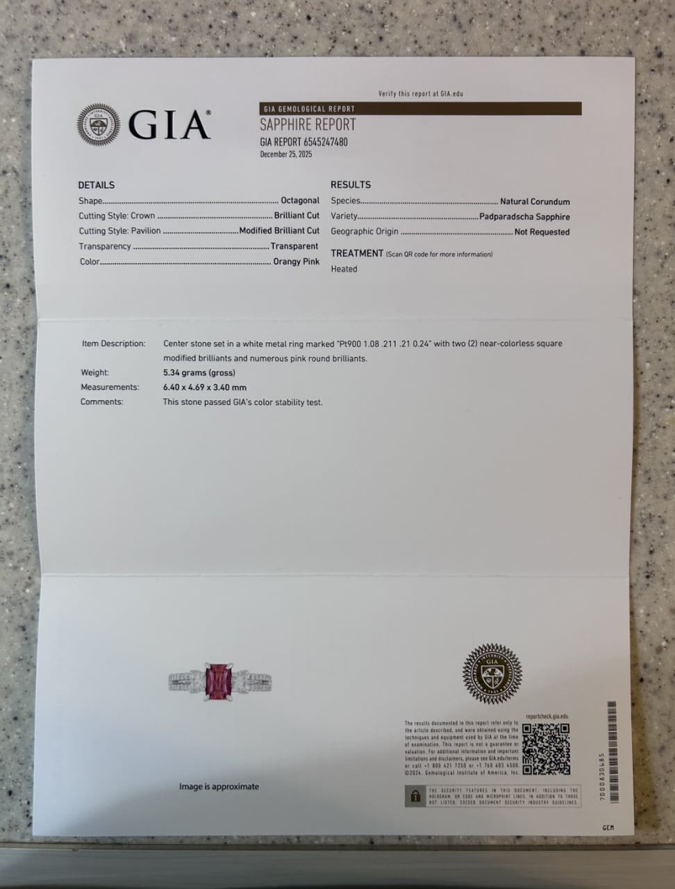 pt900 蓮の花の美しい パパラチアサファイア1.08ct GIA ダイヤ指輪