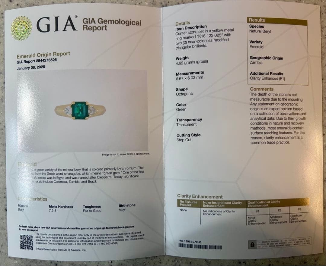 エメラルドは、その性質上、美しさを保つためにオイル含浸が施されるのが一般的ですが、この石に与えられたGIAの鑑別結果は「 F1 」。これは、エメラルドの透明度を損なう要因が極めて少なく、微細な処理に留まっていることを証明しています。