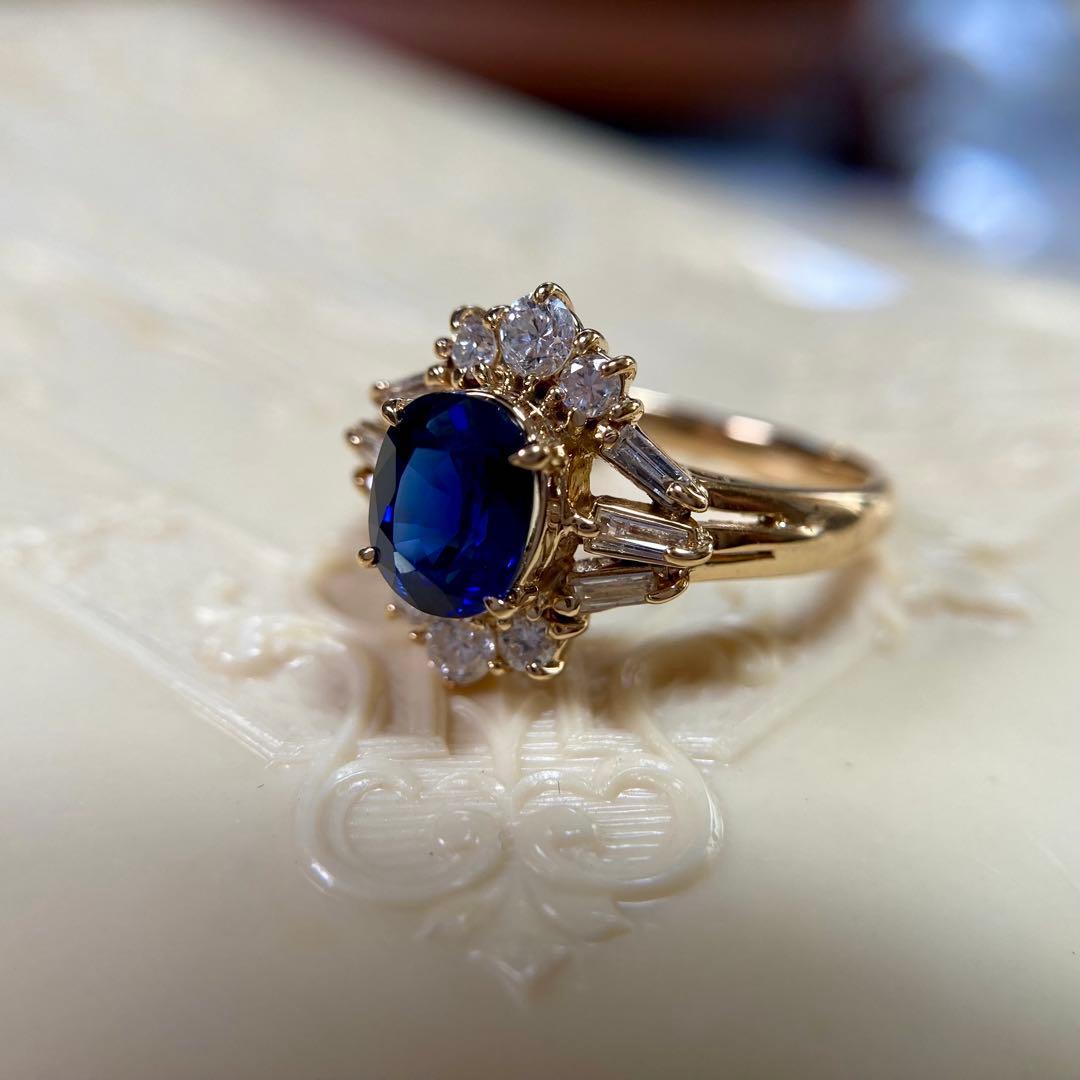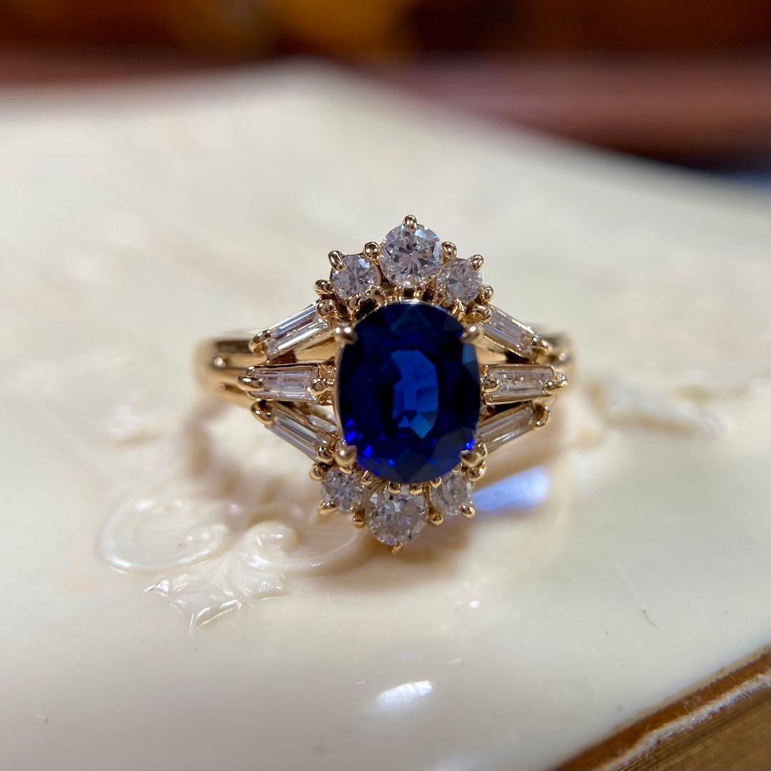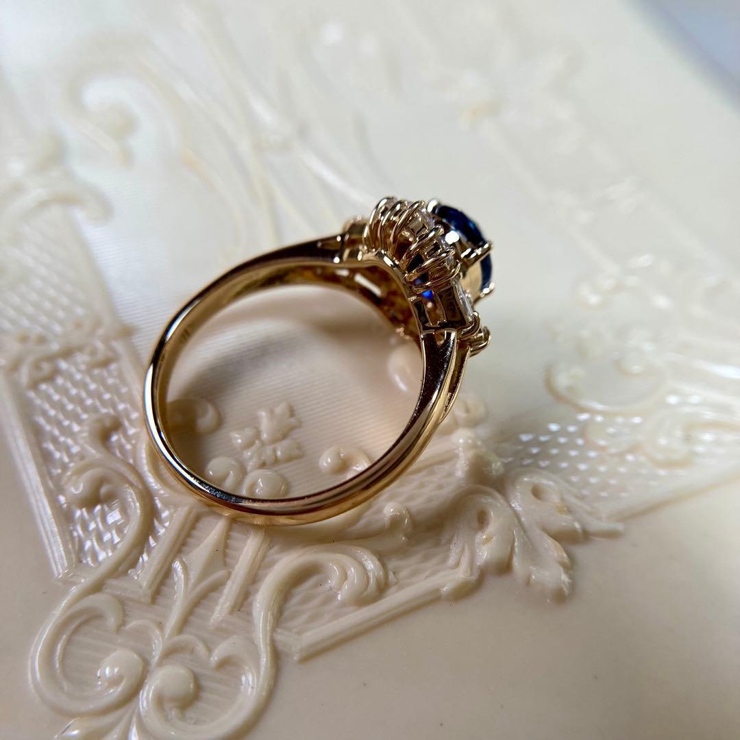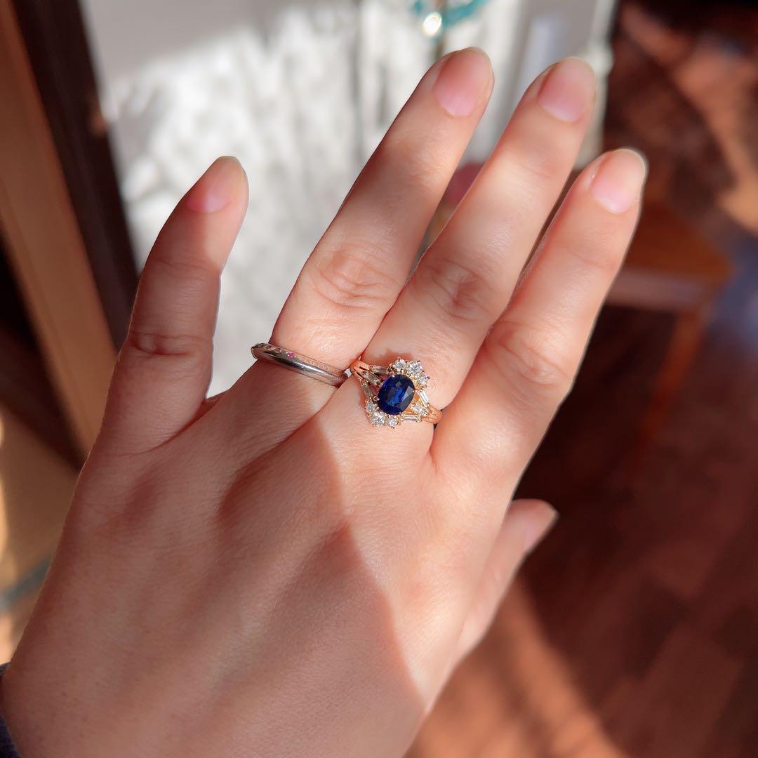ダイヤモンドの澄んだ輝きがサファイアを引き立てながらも主張しすぎることなく、あくまで主役は中央の一石。どの角度から見ても美しいバランスが保たれ、完成度の高さを感じさせます。