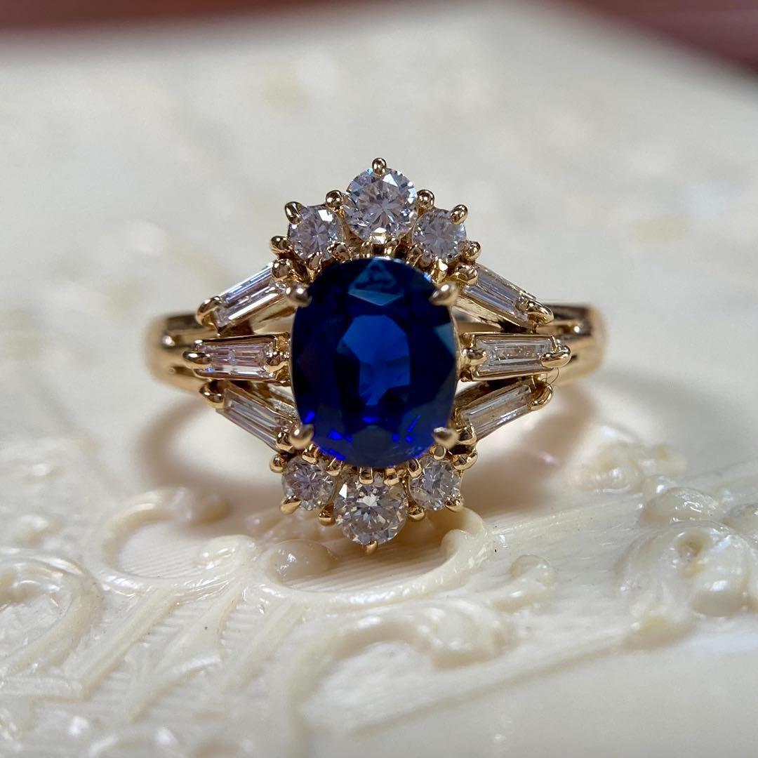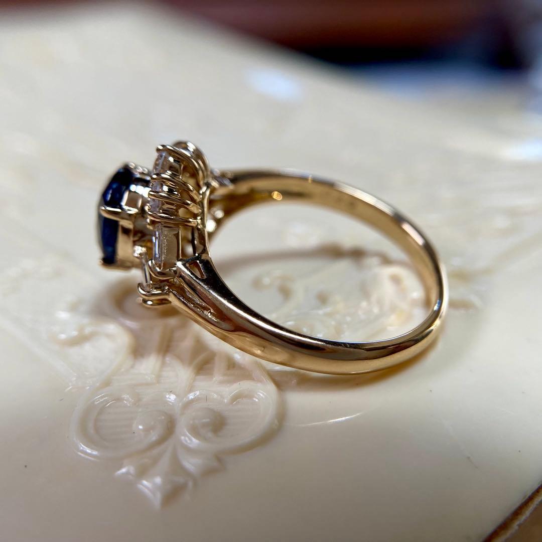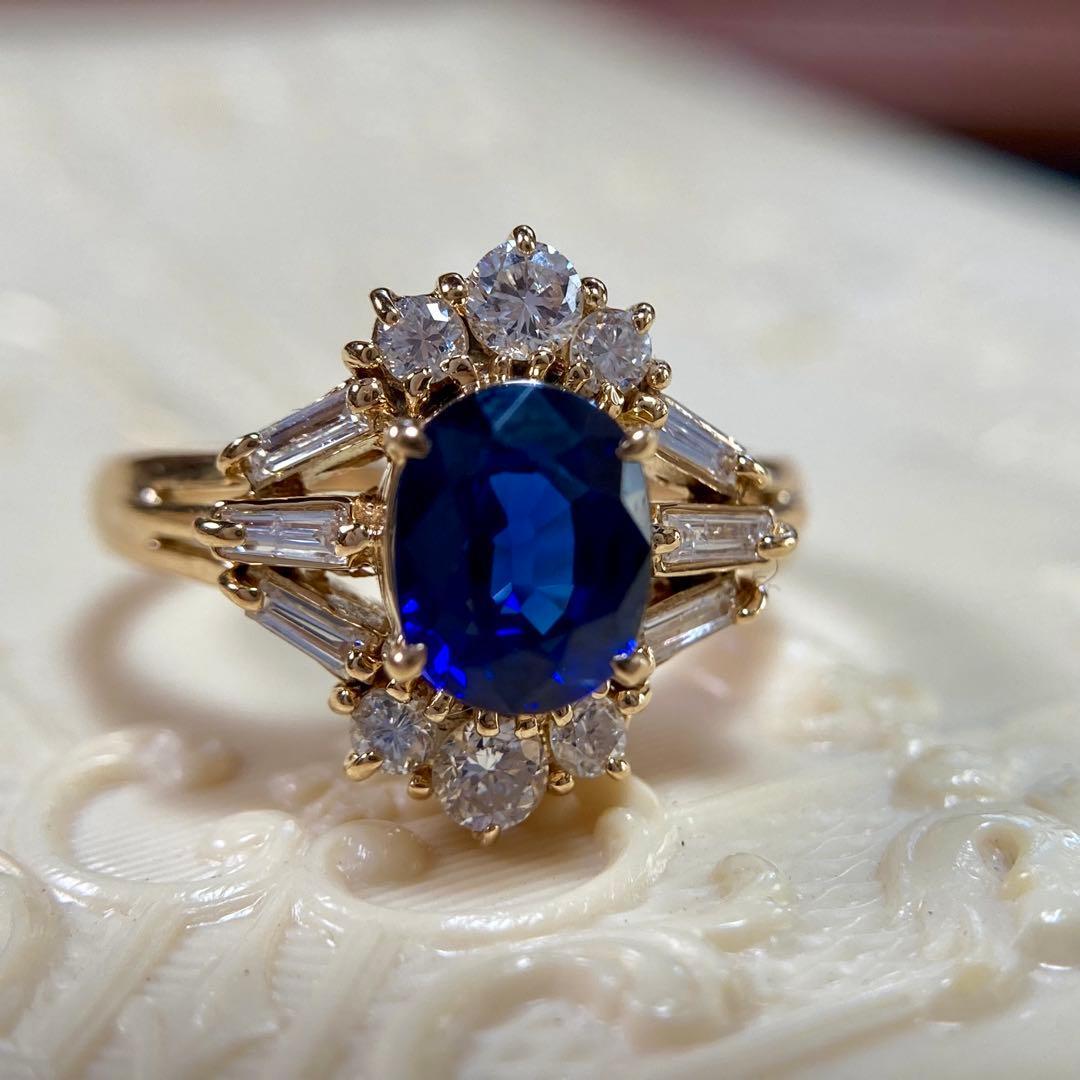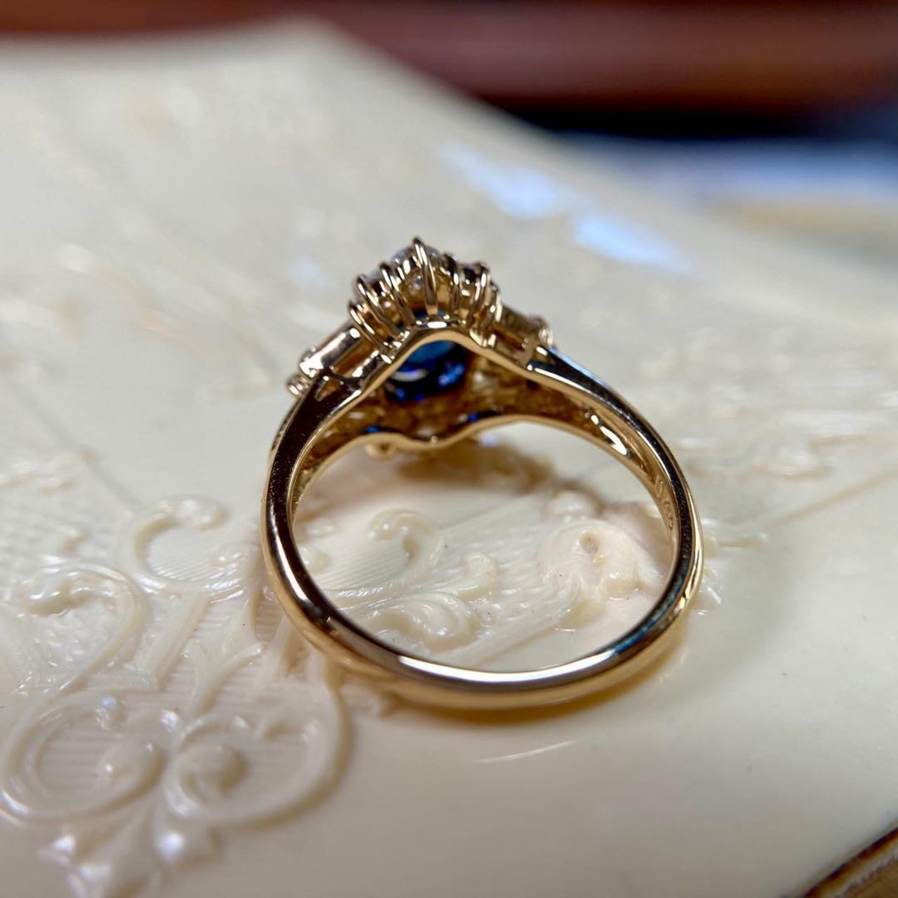 ダイヤモンドの澄んだ輝きがサファイアを引き立てながらも主張しすぎることなく、あくまで主役は中央の一石。どの角度から見ても美しいバランスが保たれ、完成度の高さを感じさせます。