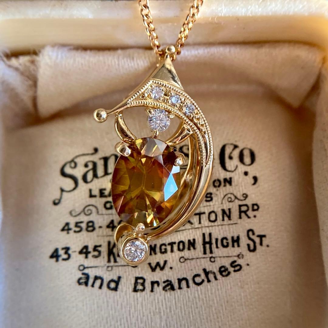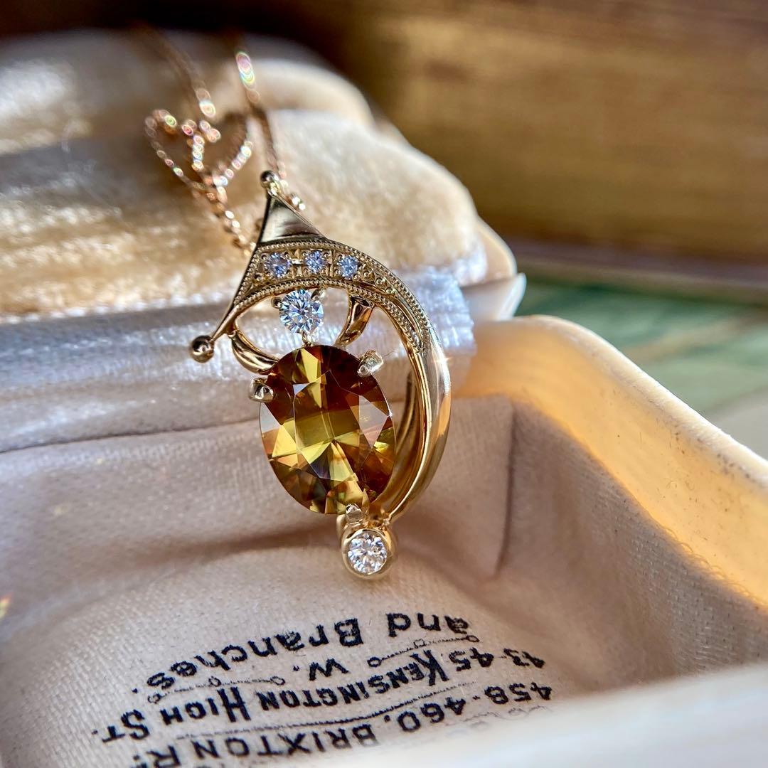 この石の最大の特徴であるダイヤモンドをも凌ぐ強い分散光は、光を受けるたびに赤やオレンジ、グリーンの鮮烈なファイアとなって溢れ出し、まるで石の内部で生命が脈動しているかのような幻想的な景色を見せてくれます。