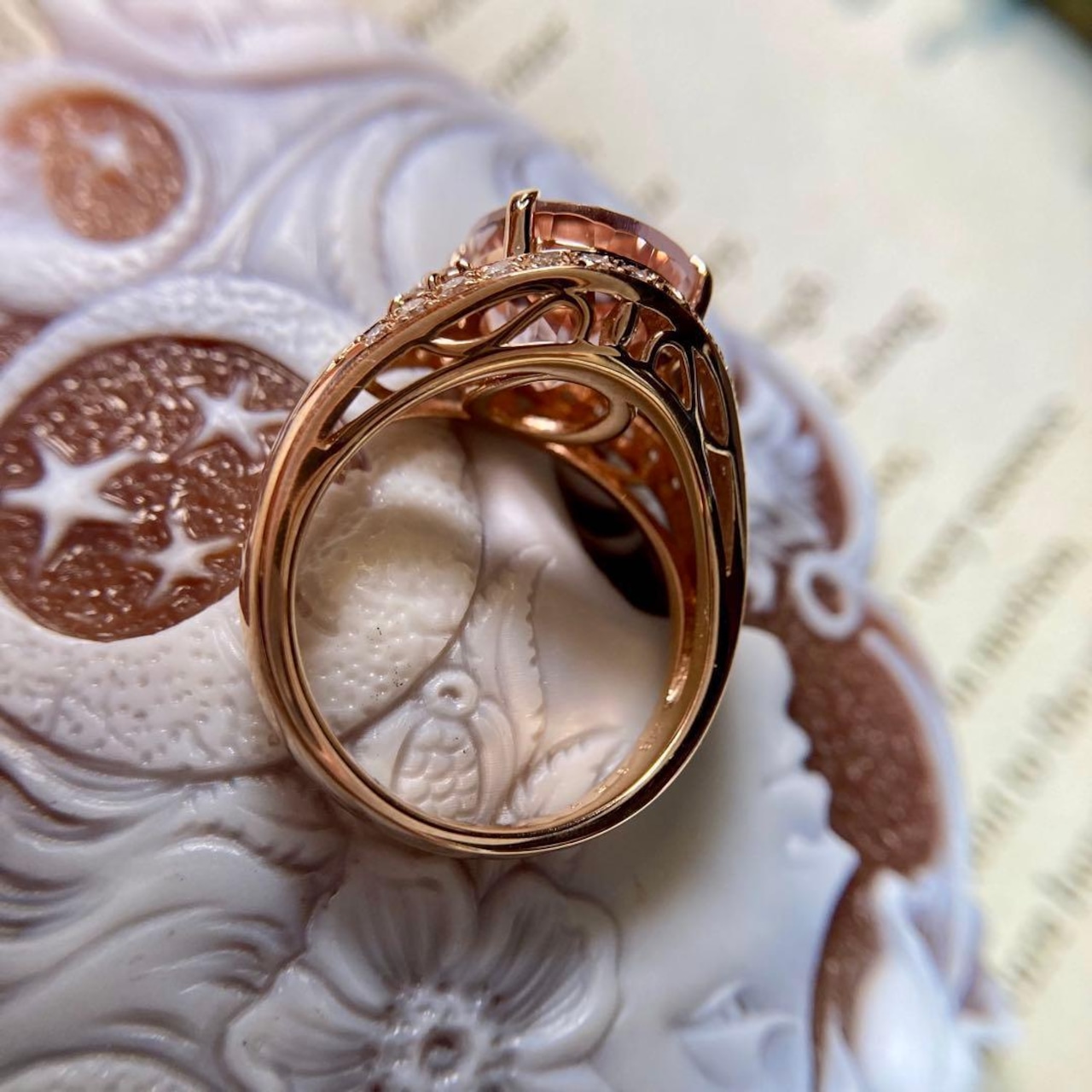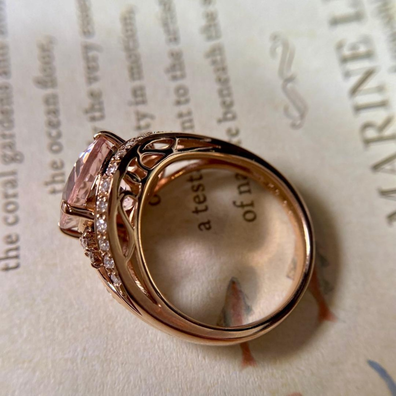 肌なじみが良く、モルガナイトの優しい色調と自然に溶け合い、リング全体に温もりと女性らしさを添えています。