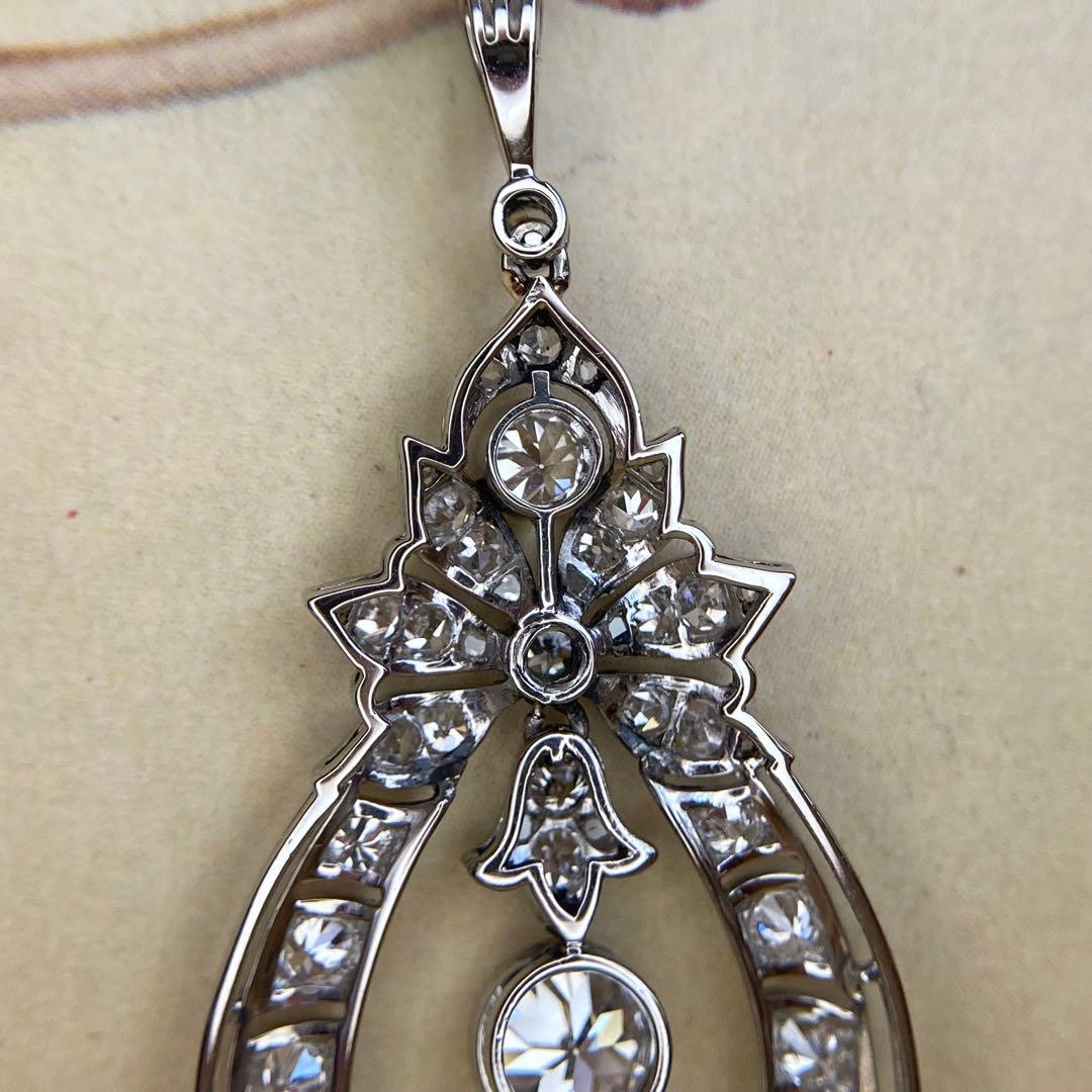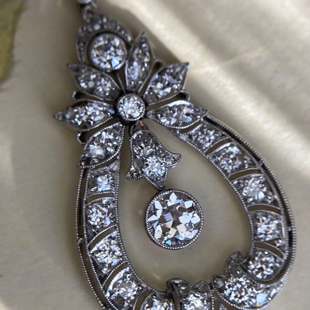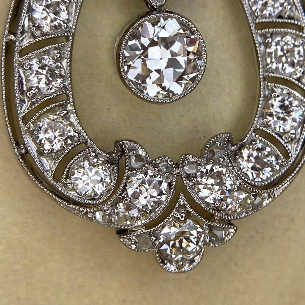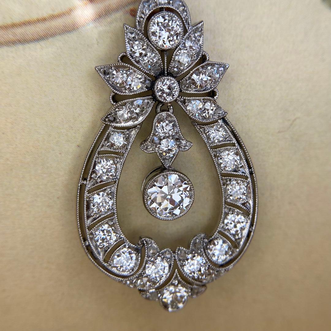 まず目を奪われるのは、中央で雫のように揺れ、潤んだような光を放つ約0.5ctのダイヤモンド。全体で合計3ct以上ものダイヤモンドが贅沢にあしらわれ、そのすべてに当時主流だったオールドヨーロピアンカットが施されています。