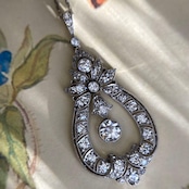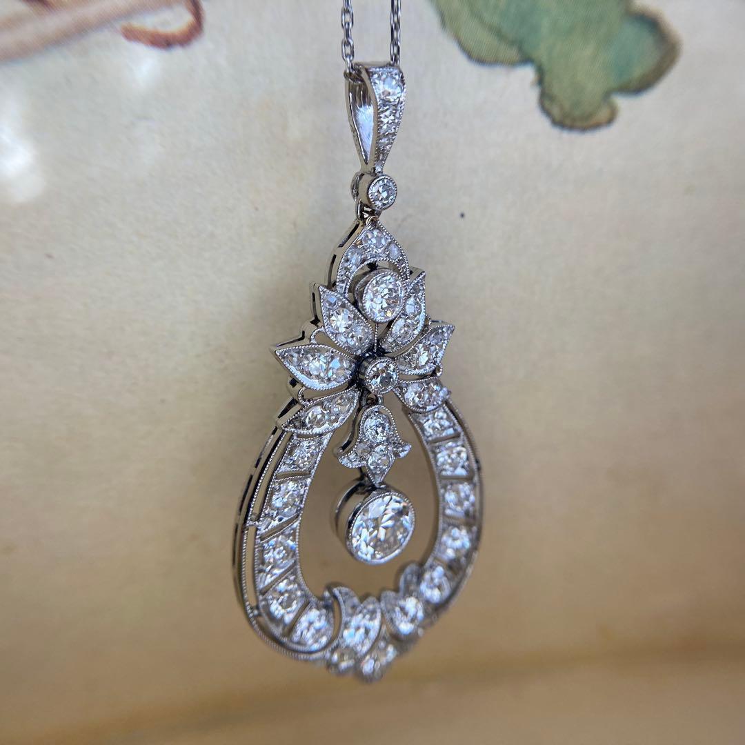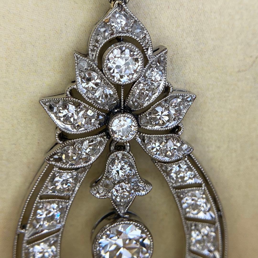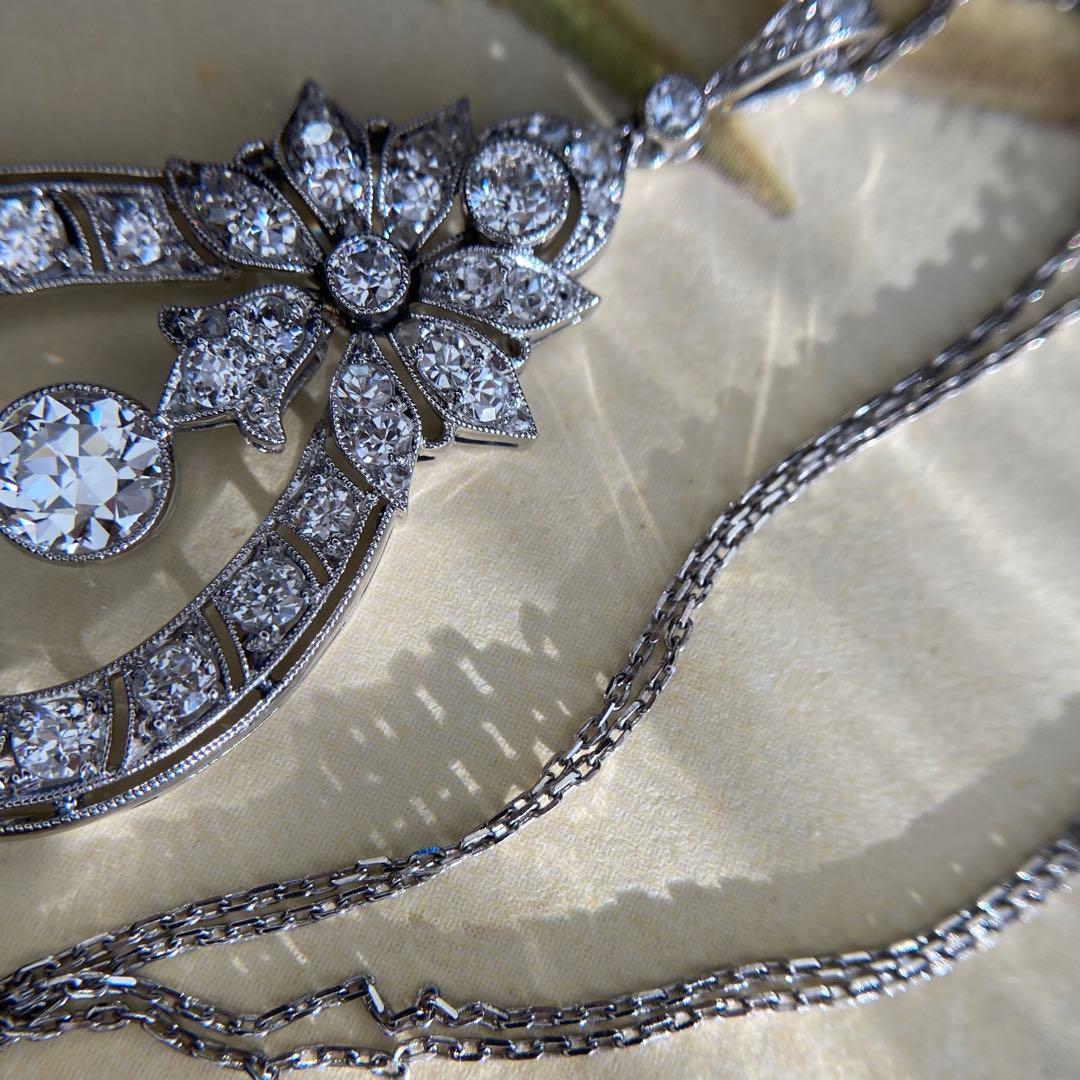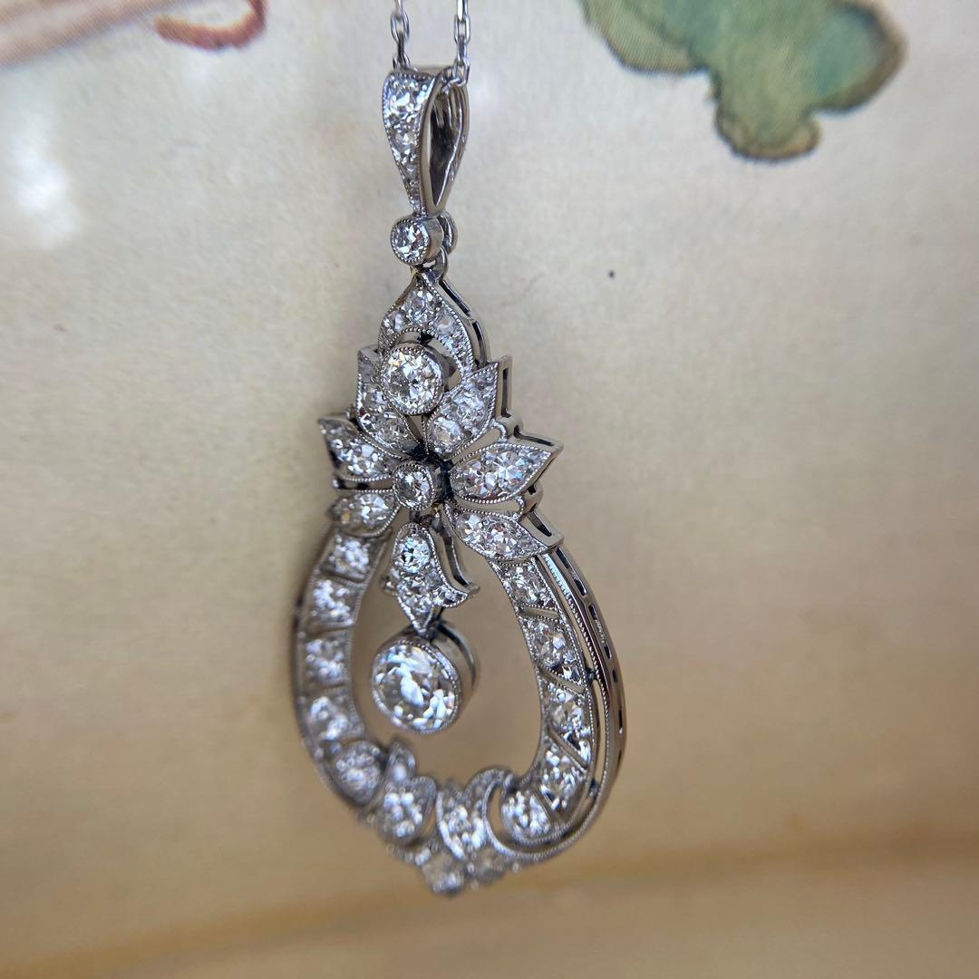まず目を奪われるのは、中央で雫のように揺れ、潤んだような光を放つ約0.5ctのダイヤモンド。全体で合計3ct以上ものダイヤモンドが贅沢にあしらわれ、そのすべてに当時主流だったオールドヨーロピアンカットが施されています。