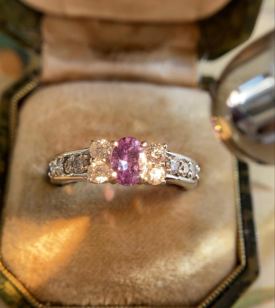 数あるアレキサンドライトの中から、色、表情、そして全体の佇まいまでを見極めて選び抜いた、これからの時間をともに過ごす持ち主のために用意されたようなリングです。