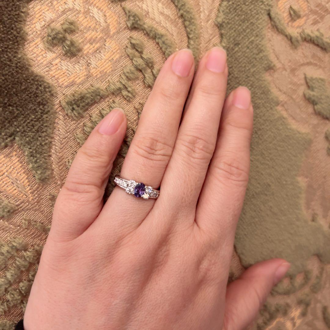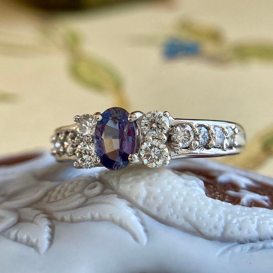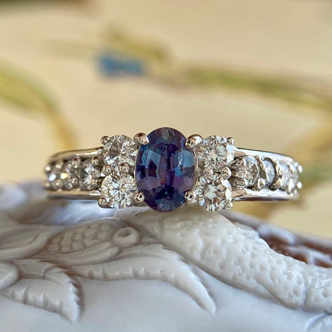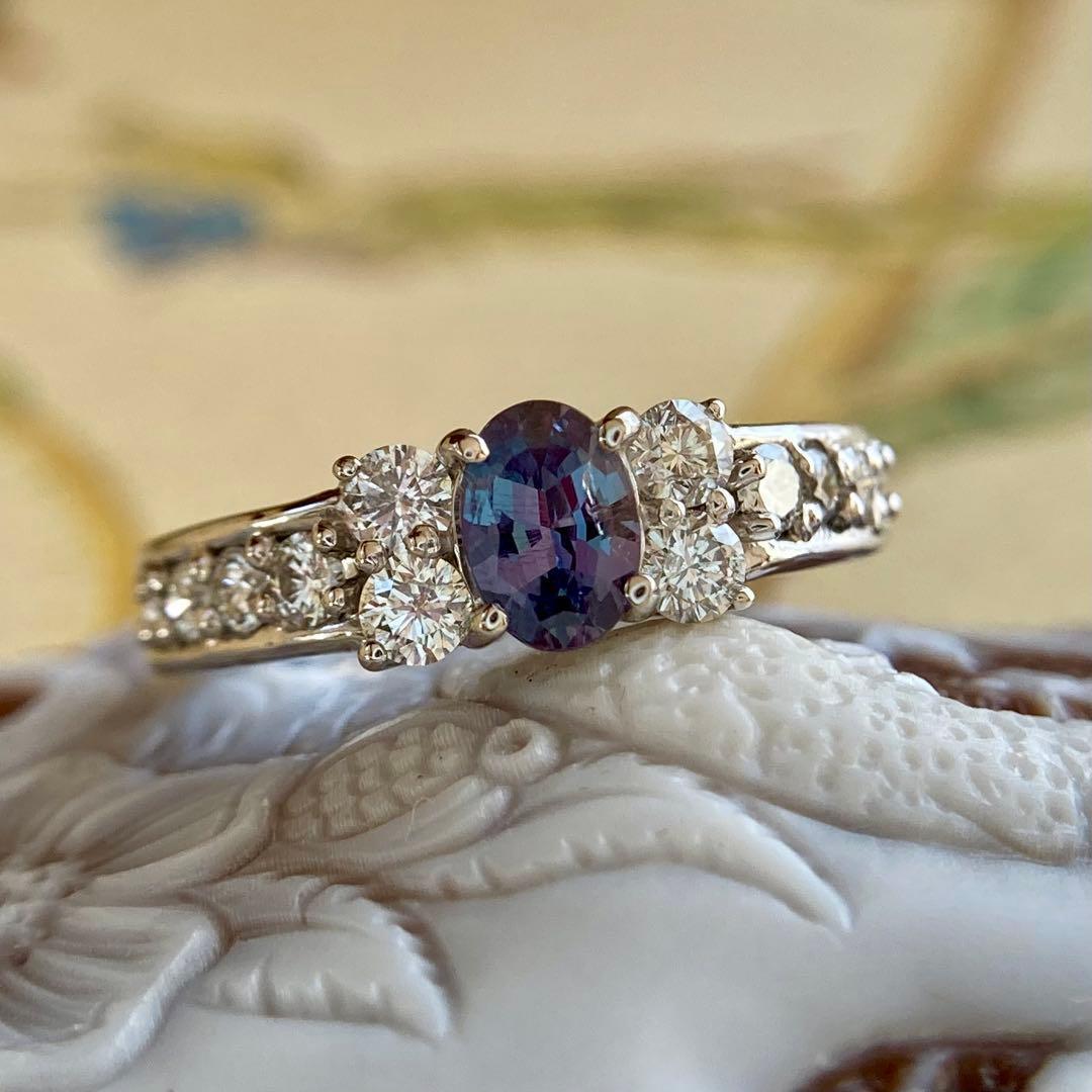 両脇にはダイヤモンドを配し、アレキサンドライトの色彩を優しく引き立てながら、リング全体としては気品ある華やかさに仕立てられています。