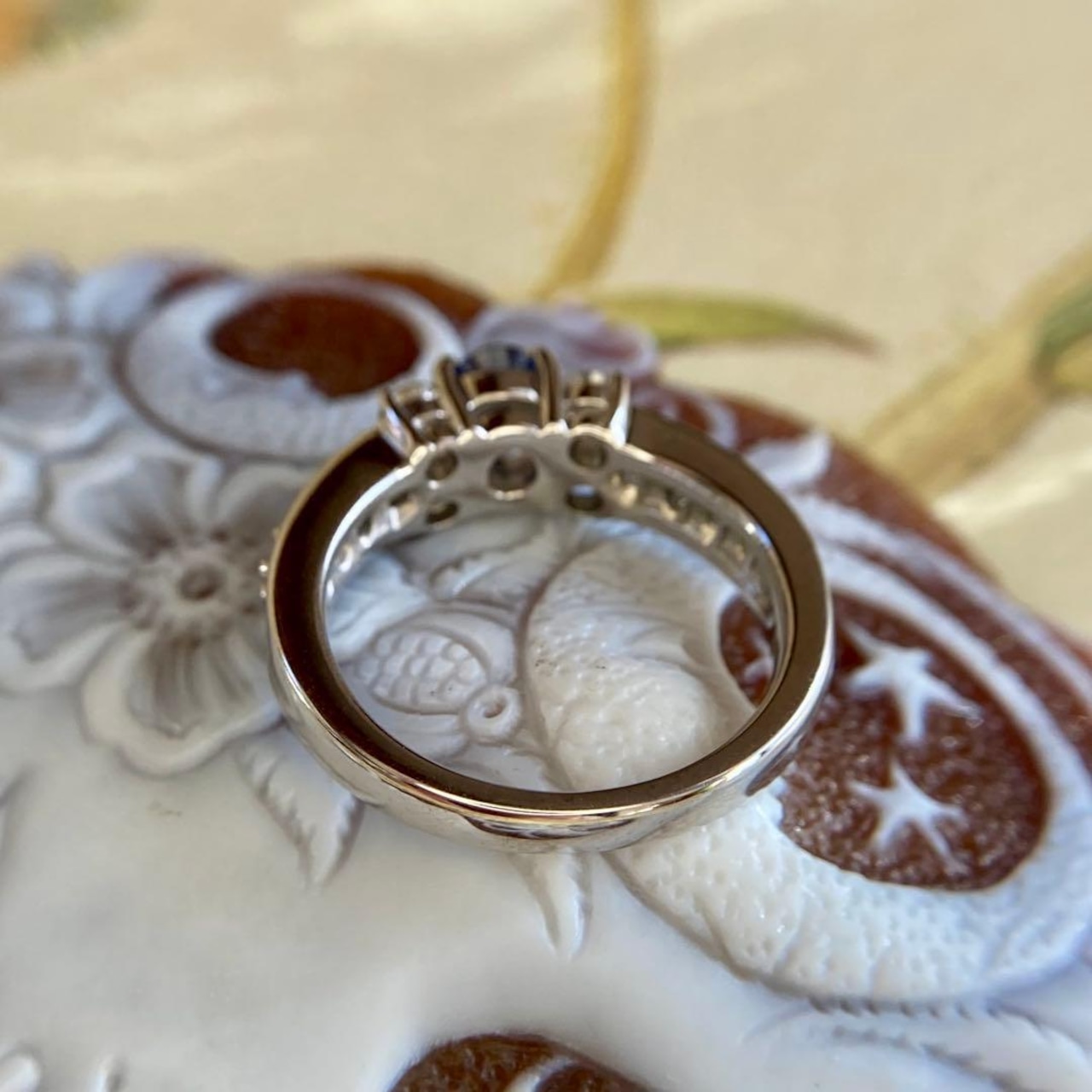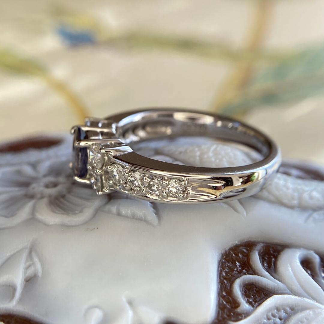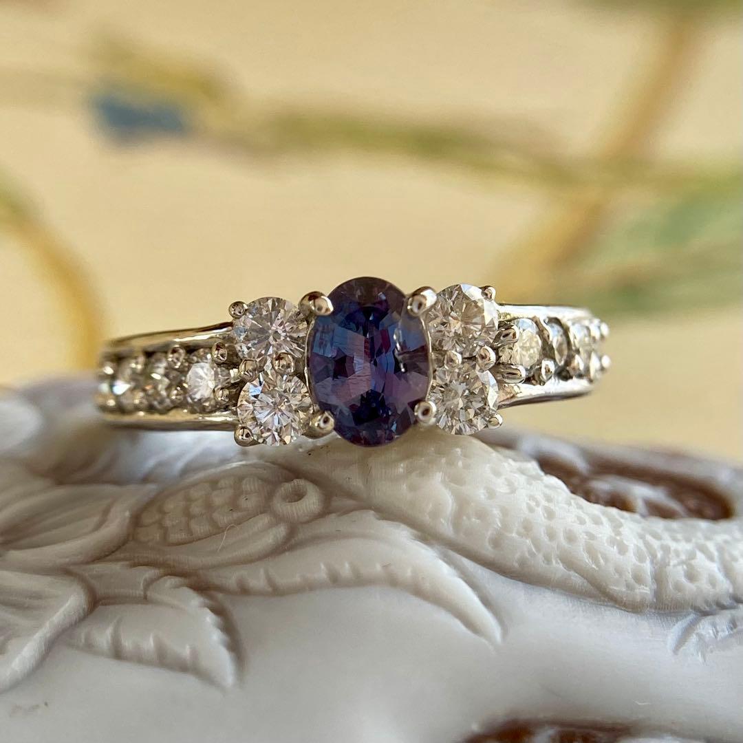 両脇にはダイヤモンドを配し、アレキサンドライトの色彩を優しく引き立てながら、リング全体としては気品ある華やかさに仕立てられています。