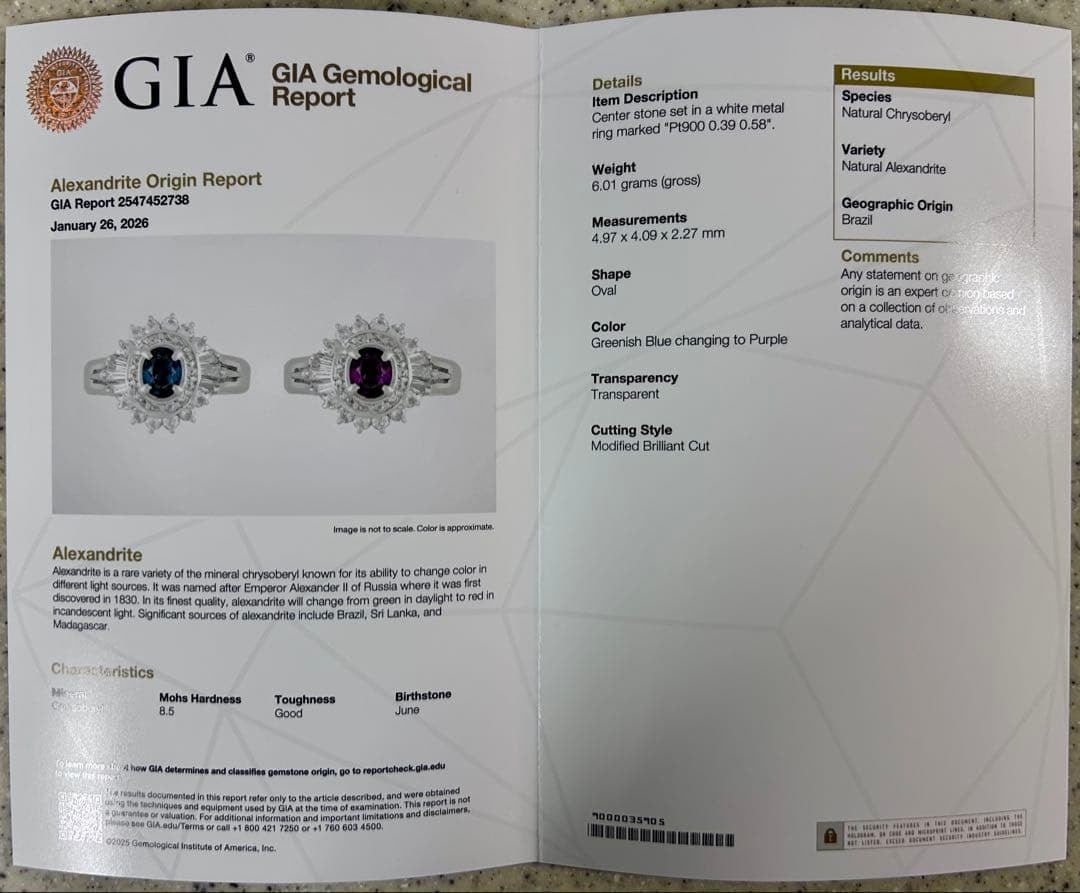 こちらのアレキサンドライトには、GIA(米国宝石学会)の鑑別書が付属しております。