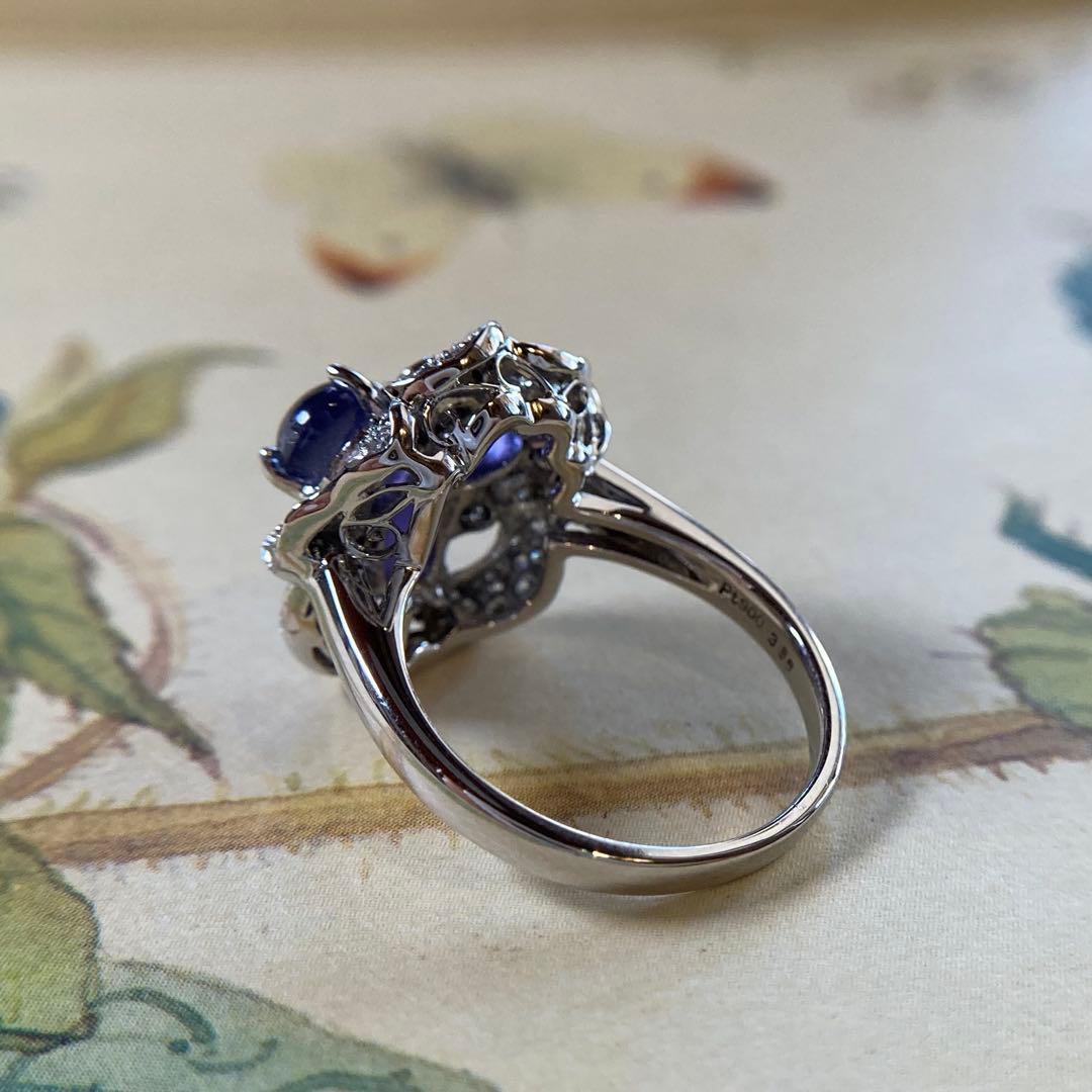 それを優雅に取り巻くのは、贅沢に配されたダイヤモンド。光を受けて繊細に瞬くその煌めきは、中心のサファイアをより一層引き立て、リング全体に華やかなリズムを生み出します。花びらを思わせる柔らかなデザインは、豪華でありながら決して重たくならず、「可愛らしさ」と「上品さ」を絶妙なバランスで兼ね備えています。