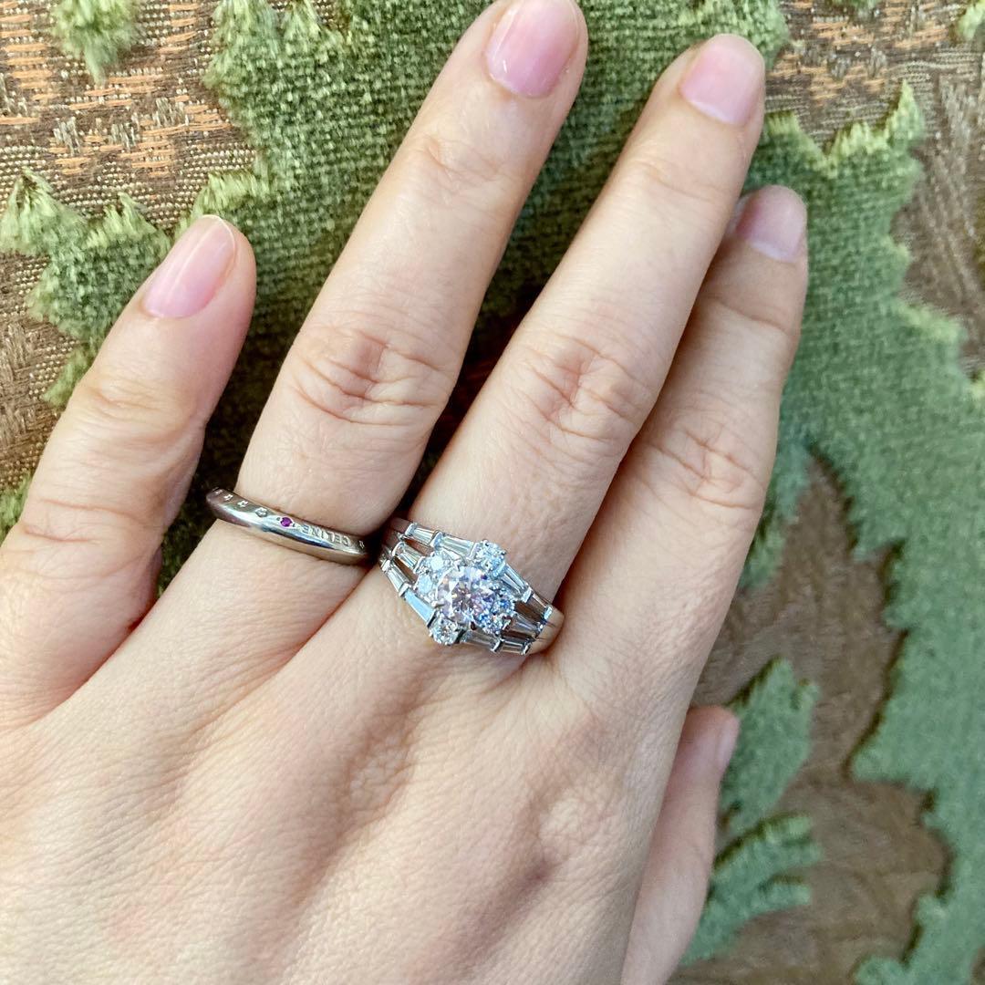 輝きの質感を巧みに変化させることで、センターストーンの色彩をより美しく引き立てるお仕立てとなっており、バゲットカット特有の端正で澄んだ光は、華やかさの中に知性と洗練を添え、指元をすっきりと優雅な印象へ導きます。